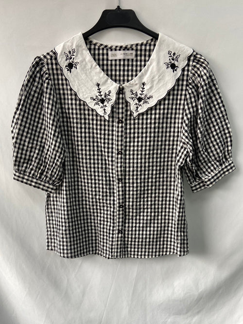 ANCAR. Camisa blanca volante engomado azul oscuro
