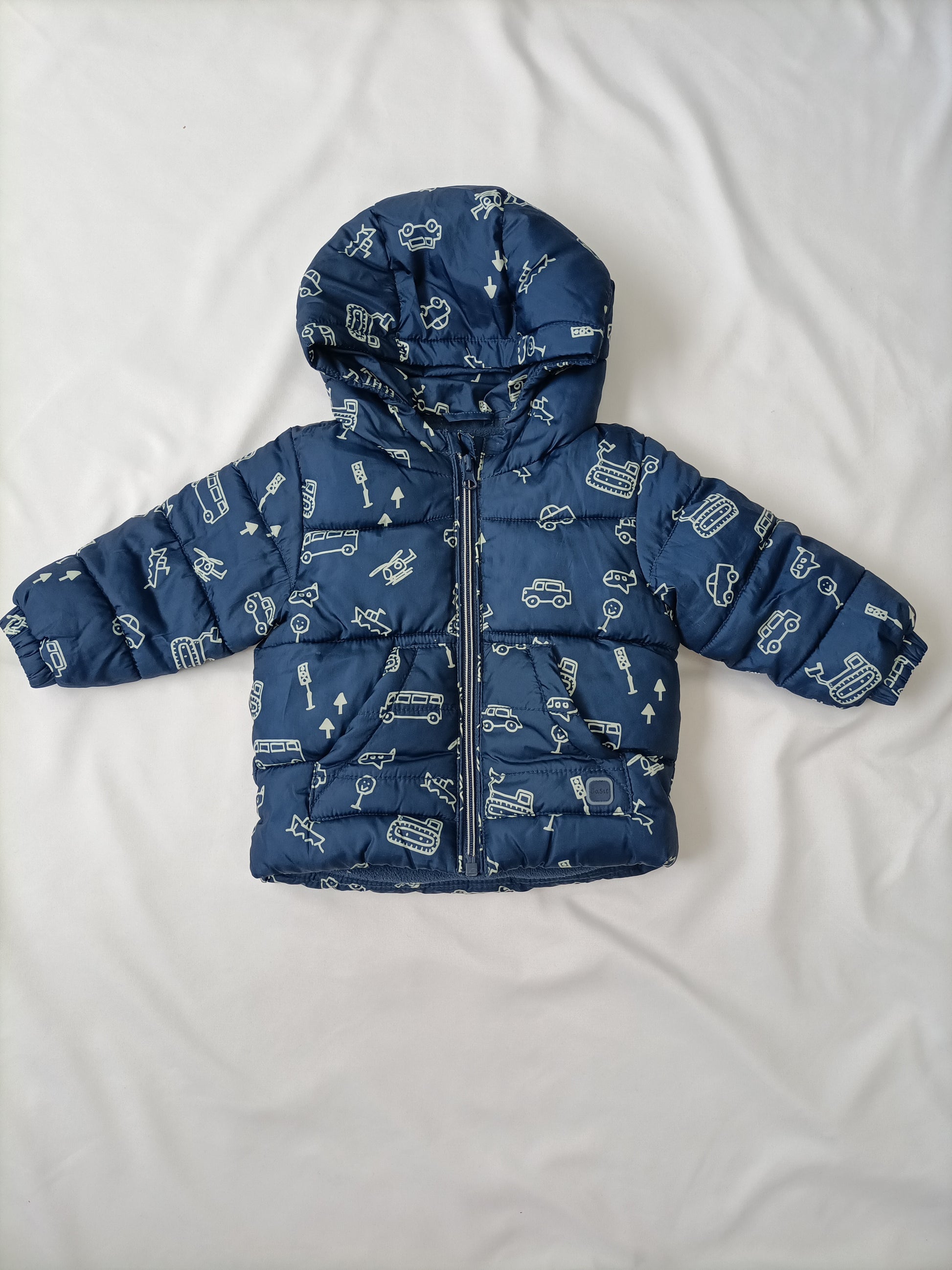 Plumas azul marino con dibujos de vehículos en blanco. Interior de forro polar. De sisa a sisa 30 cm largo 33 cm