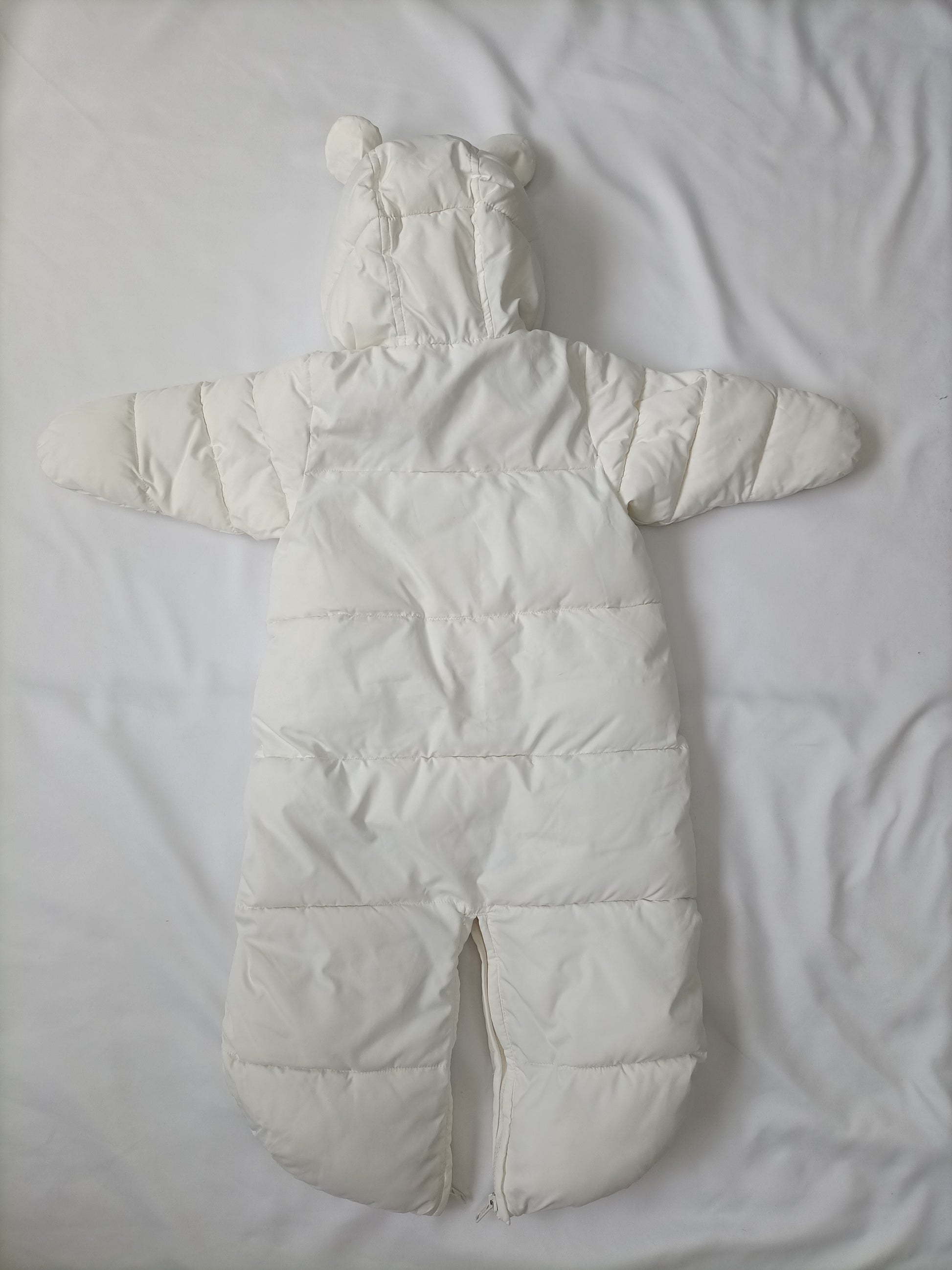 Abrigo estilo plumas enterizo con cremallera delantera y en las piernas. Interior de forro polar. De sisa a sisa 28 cm largo 57 cm