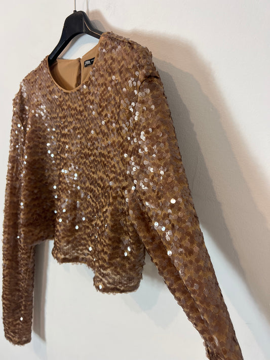 ZARA. Pantalón lentejuelas beiges y dorados. T S