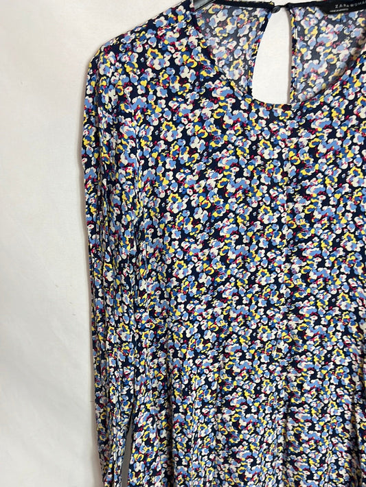 ZARA. Vestido midi camisero azul y negro. T XS