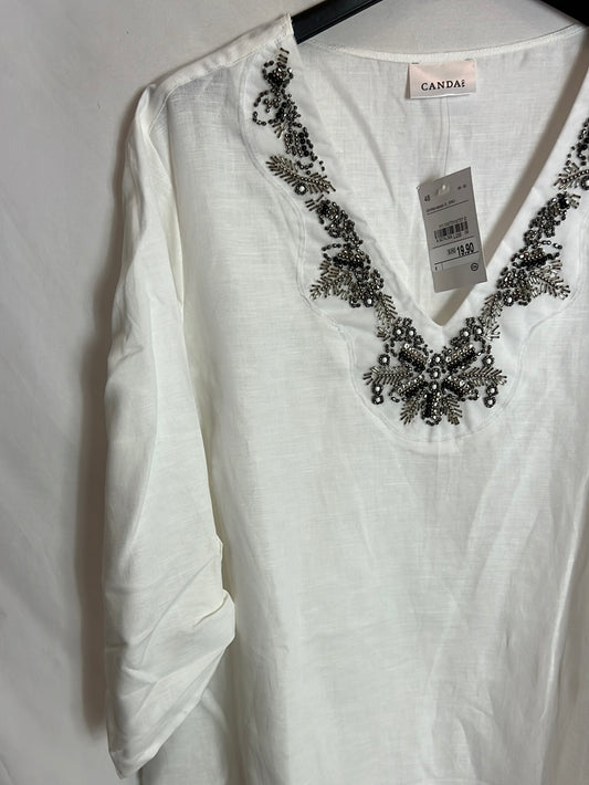 CANDA. Blusa blanca detalle abalorios cuello. T 48
