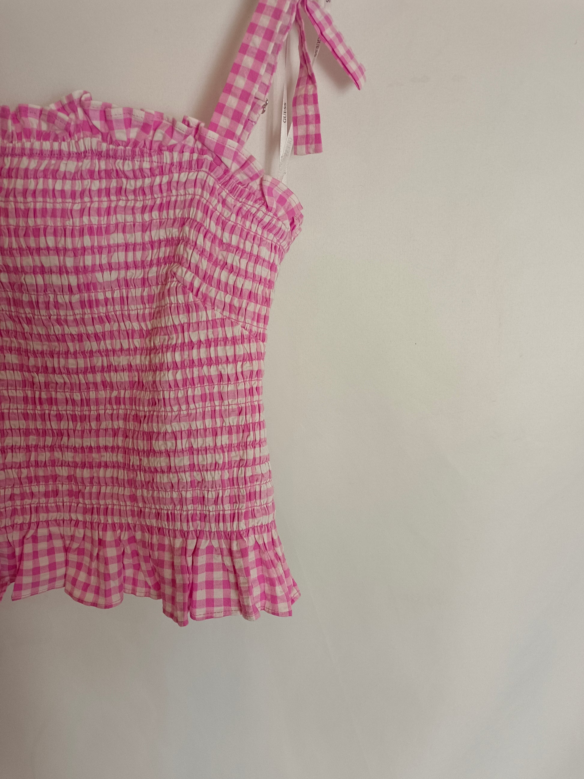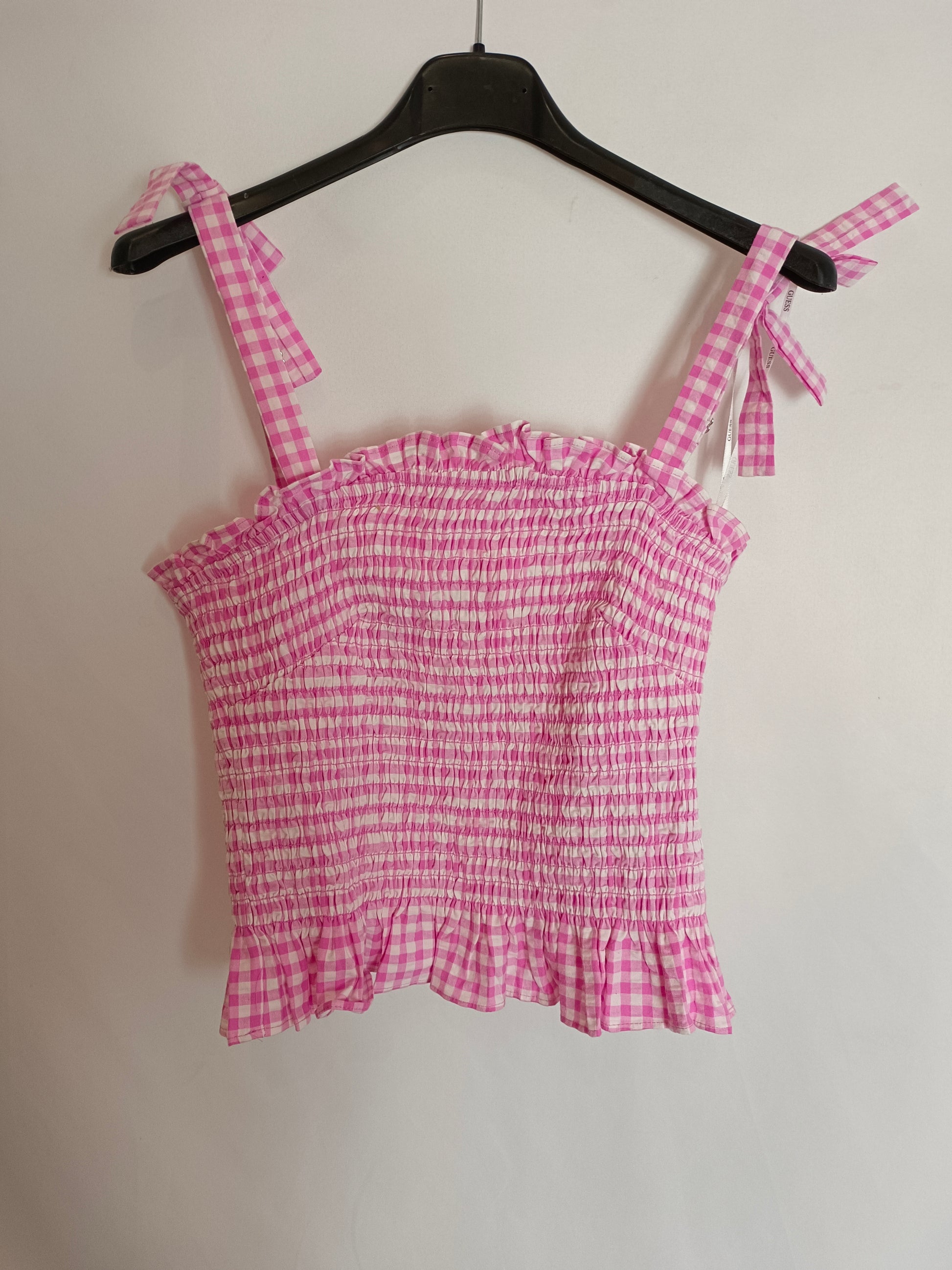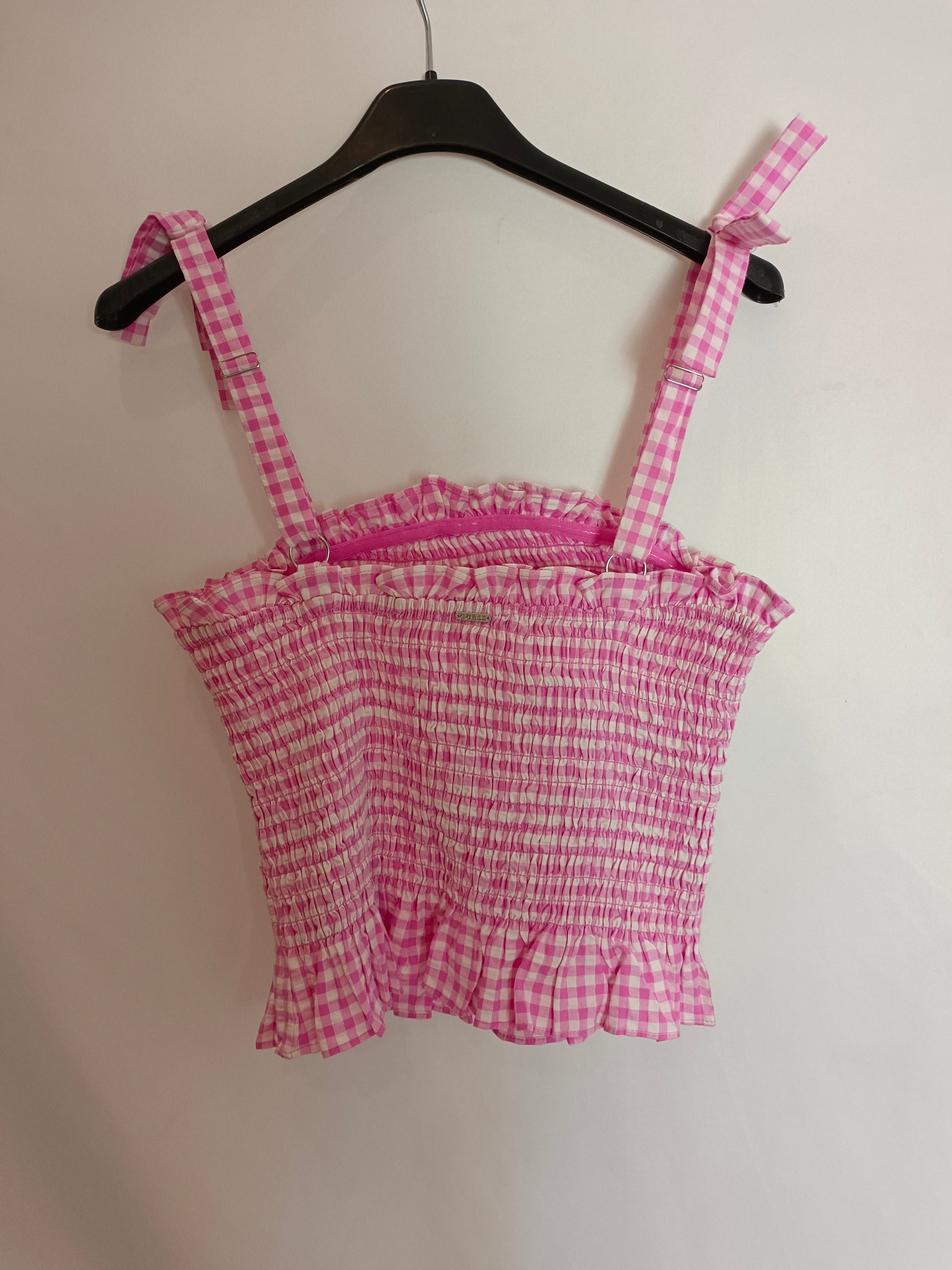 top rosa y blanco de cuadros vichí de nido de abeja. Elástico con tirantes ajustables