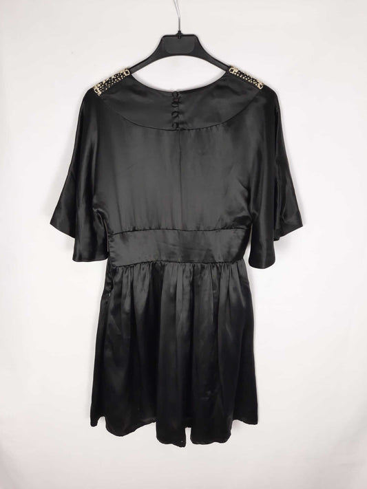 PEDRO DEL HIERRO. Vestido corto saten negro bordado en escote T.38