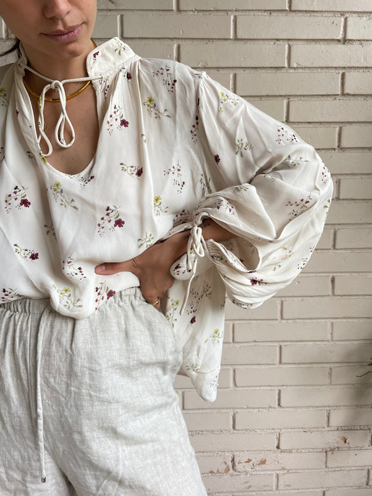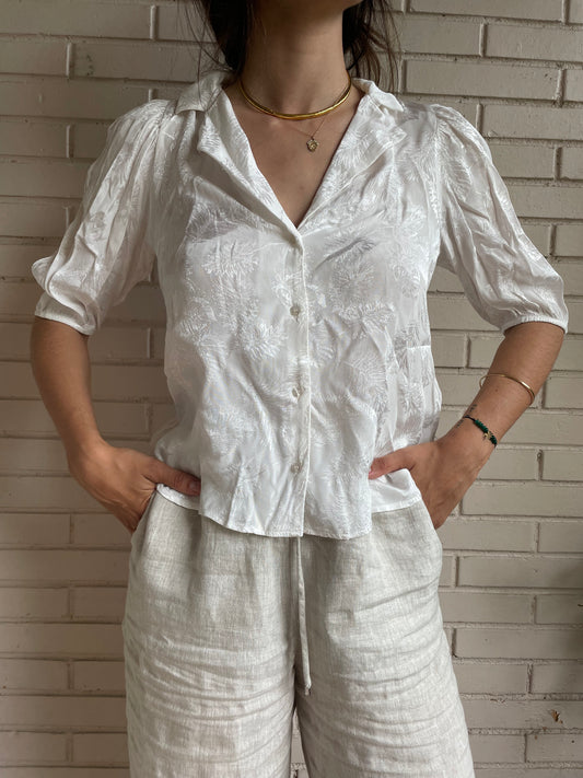 MAJE.Blusa blanca satinada estampada T.1(xs/s)