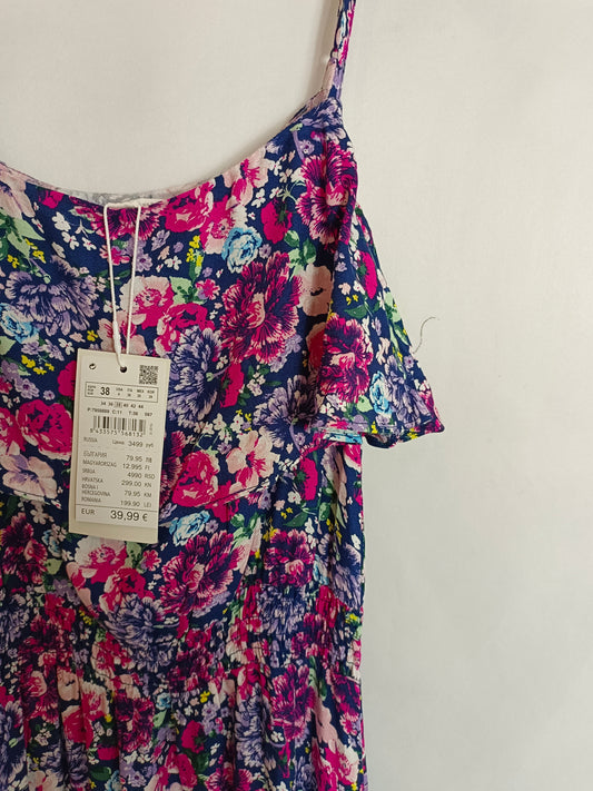 MANGO. Vestido flores rosas y rojas cruzado. T M