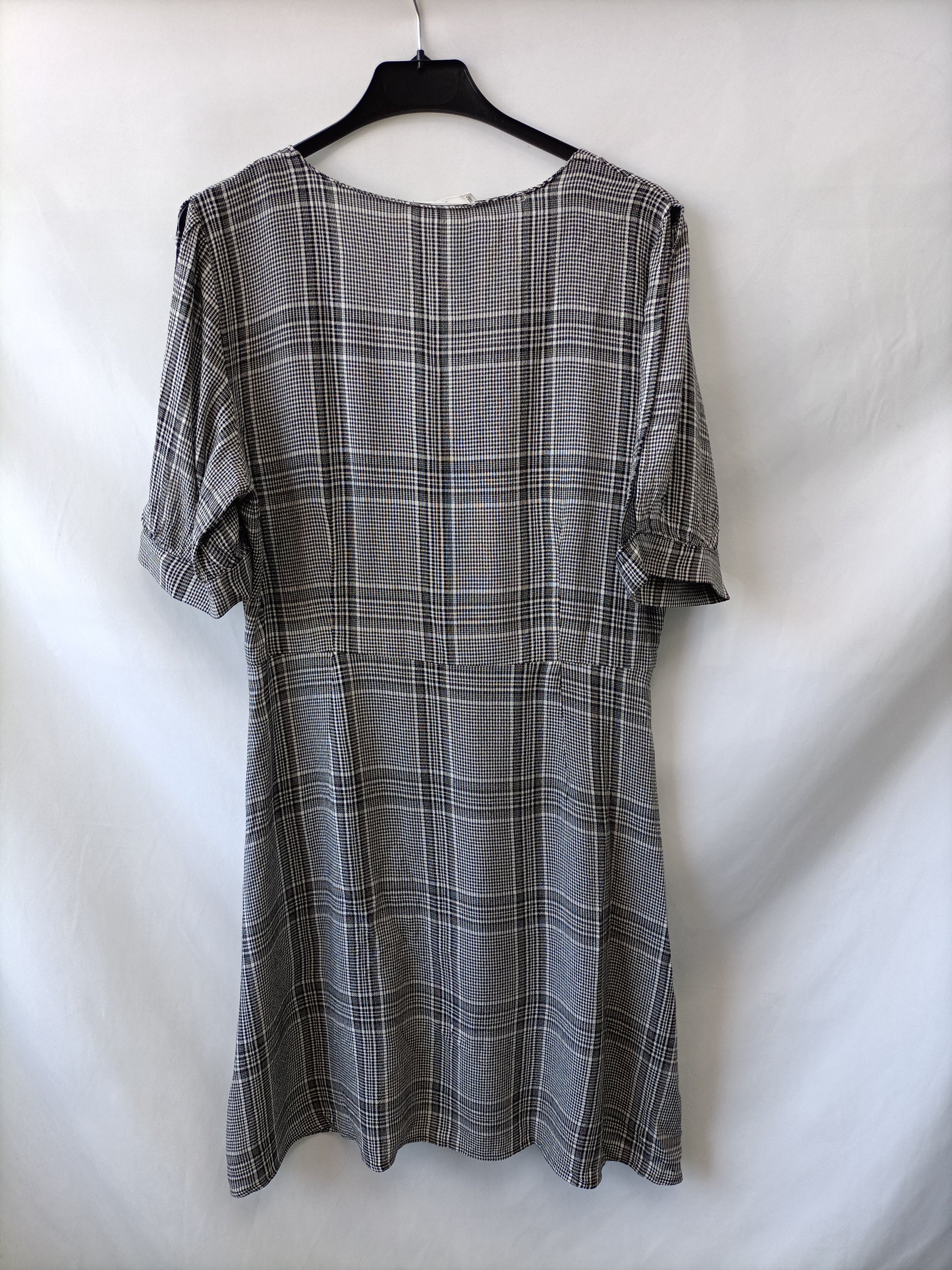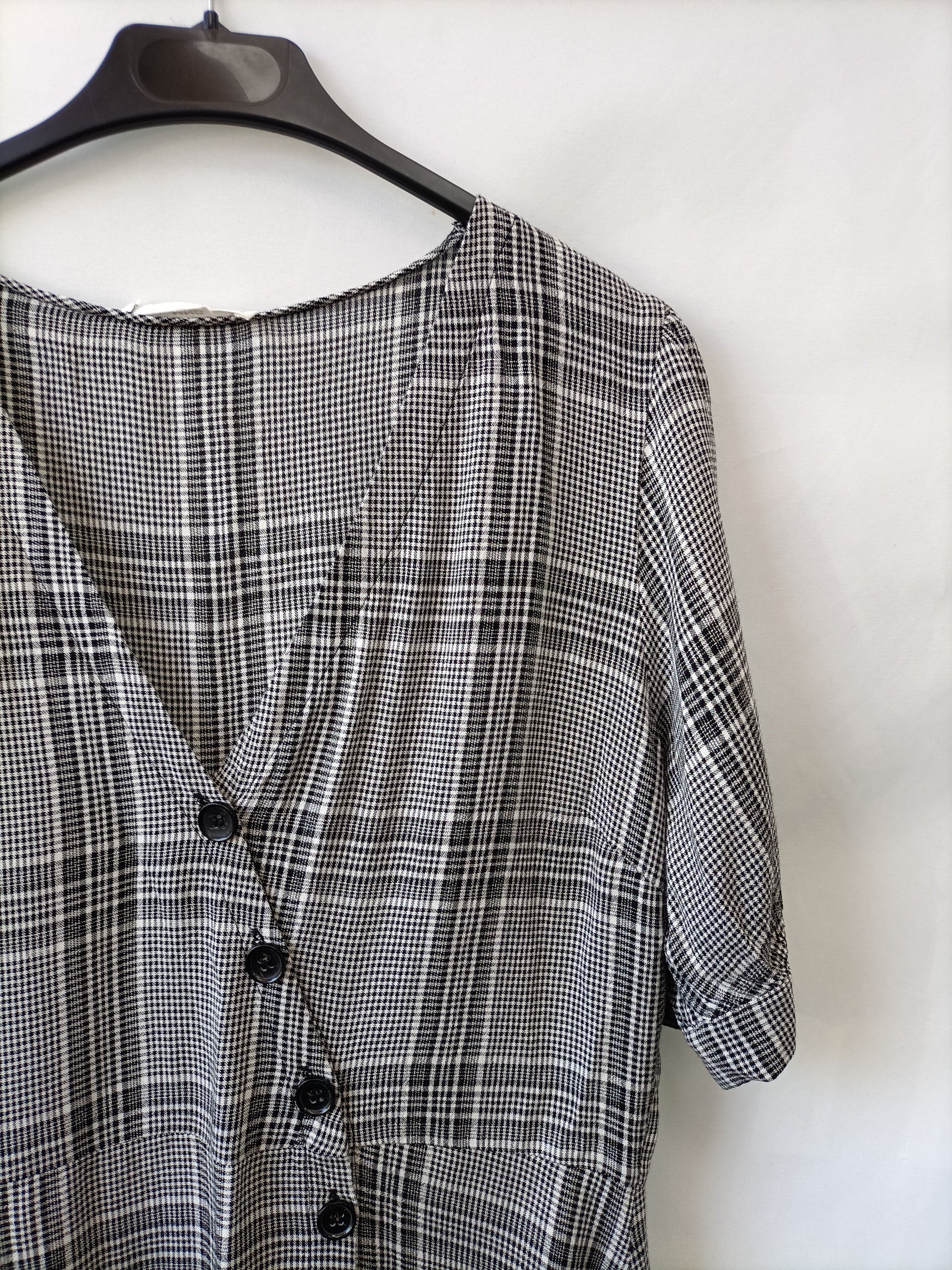 Mango. Vestido de cuadros grises y abotonada. Hombros al descubierto. Fluido y no elástico. De sisa a sisa 50 cm largo 90 cm