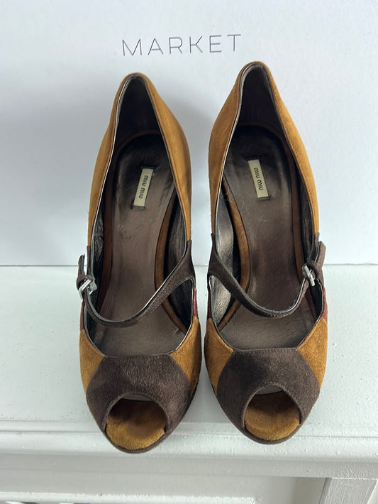 MIU MIU. Tazones peeptoes marrones detalle tacón. T 37,5