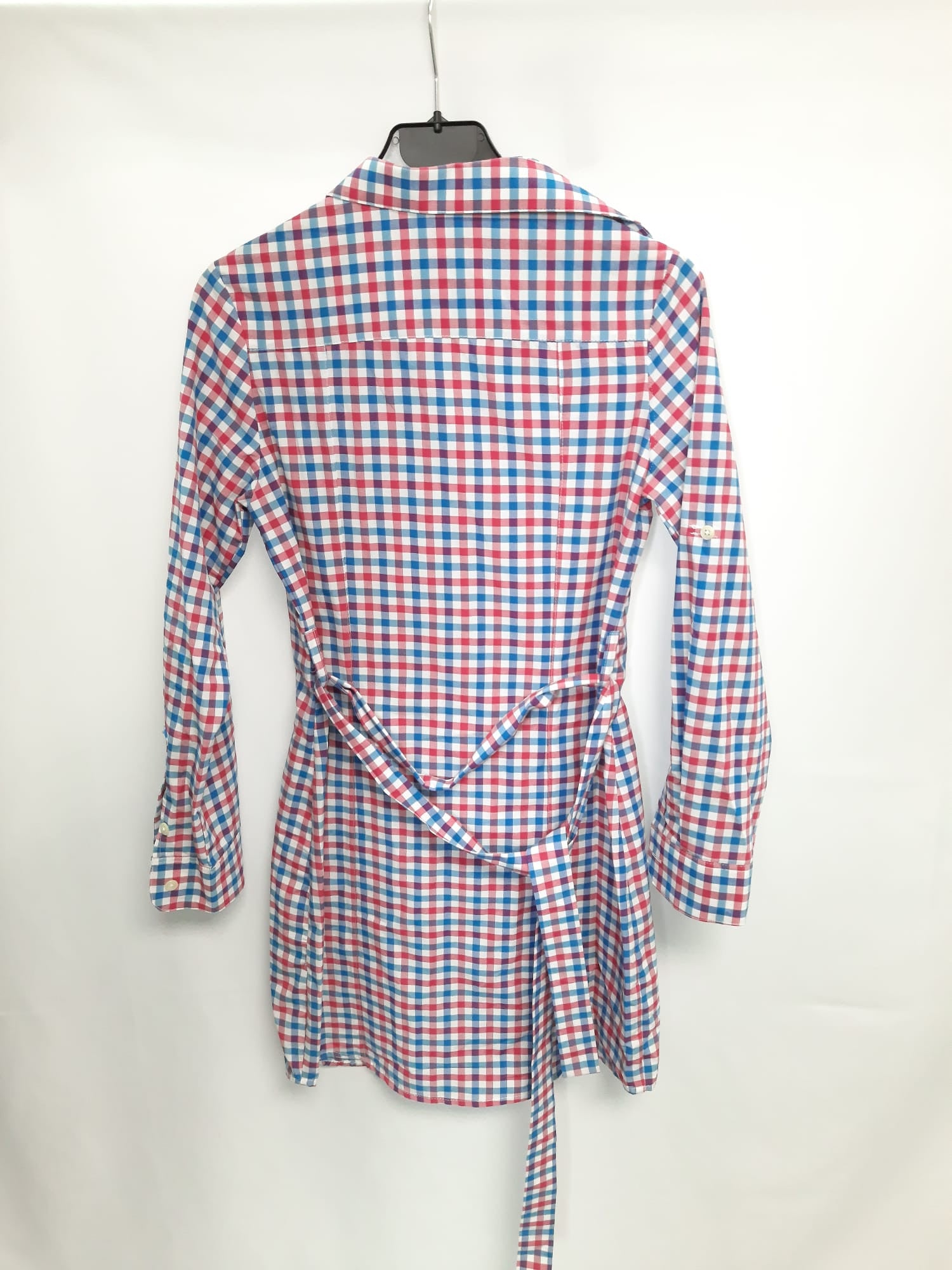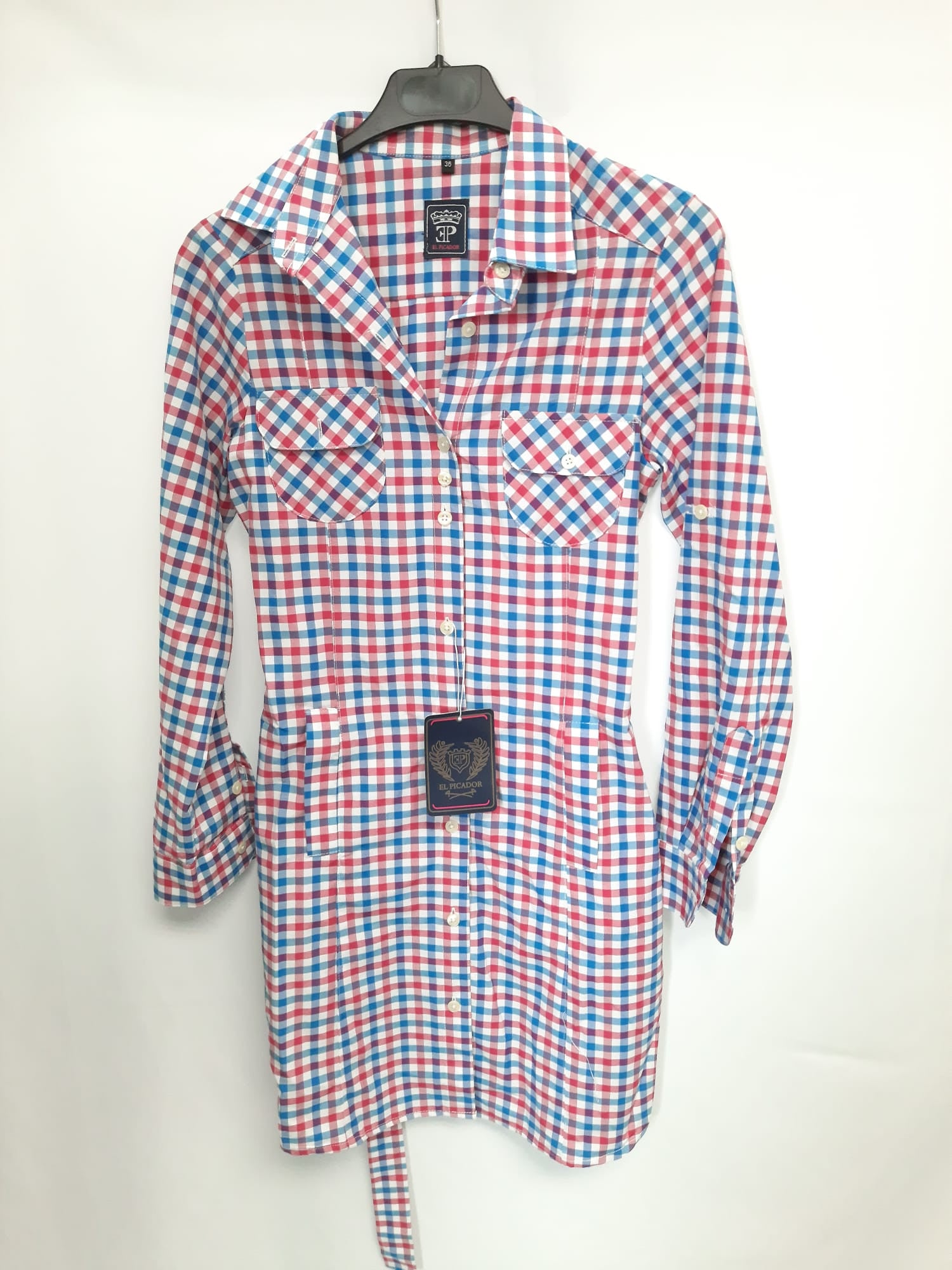 El picador. 36. Vestido camisero corto de cuadros en tonos azules, blancos y rosas. Tiene cinturón estilo lazada incorporado