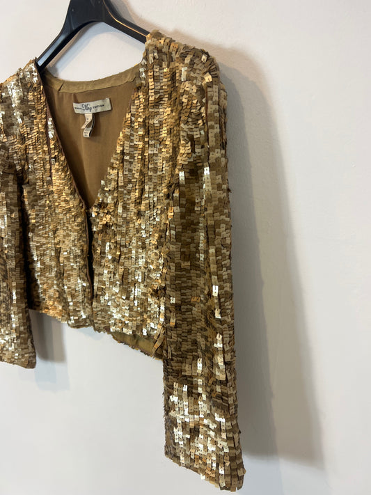 MANGO. Chaqueta corta lentejuelas doradas. T M