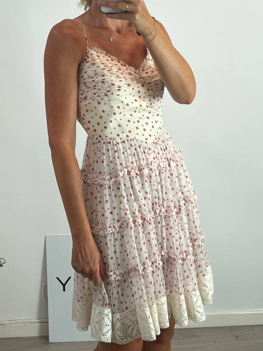 ALMA AGUILAR. Vestido seda volates y lunares. T 38