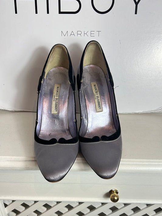 MANOLO BLAHNIK. Stilettos morados detalle en negro. T 39.5
