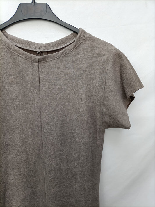 OTRAS. Vestido midi marrón claro y encaje. T M/L