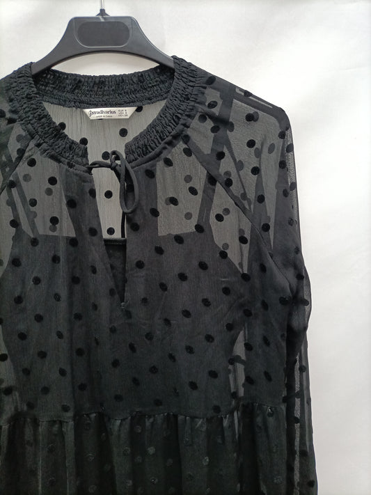 STRADIVARIUS. Vestido negro corto fluido con lunares T. l