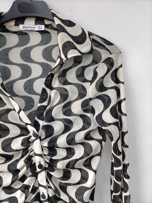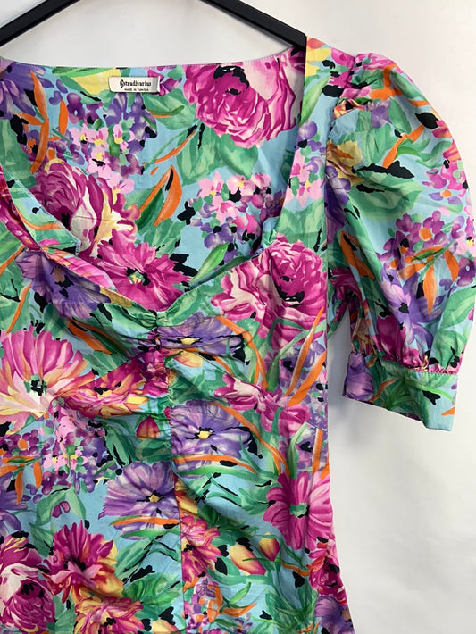 STRADIVARIUS.Top formal flores moradas y doradas T.S
