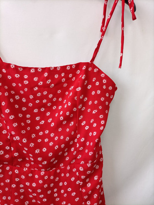 GALANTHYA. Vestido largo rojo flores y volantes T.xs