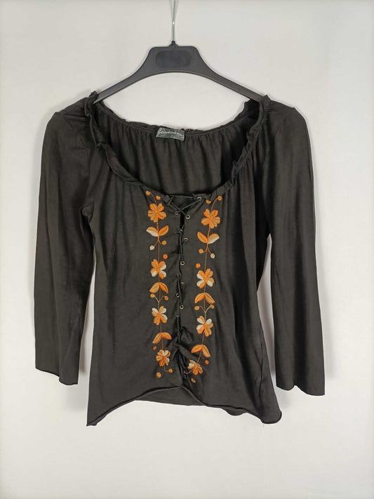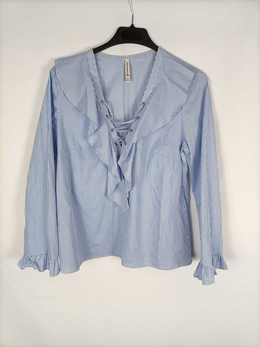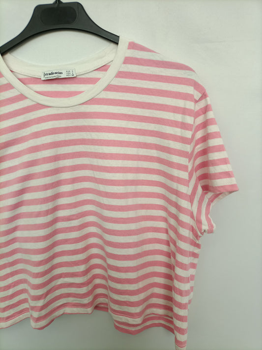 STRADIVARIUS. Camisa rayas flores bordadas T.s
