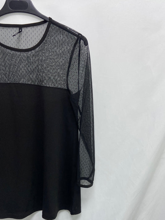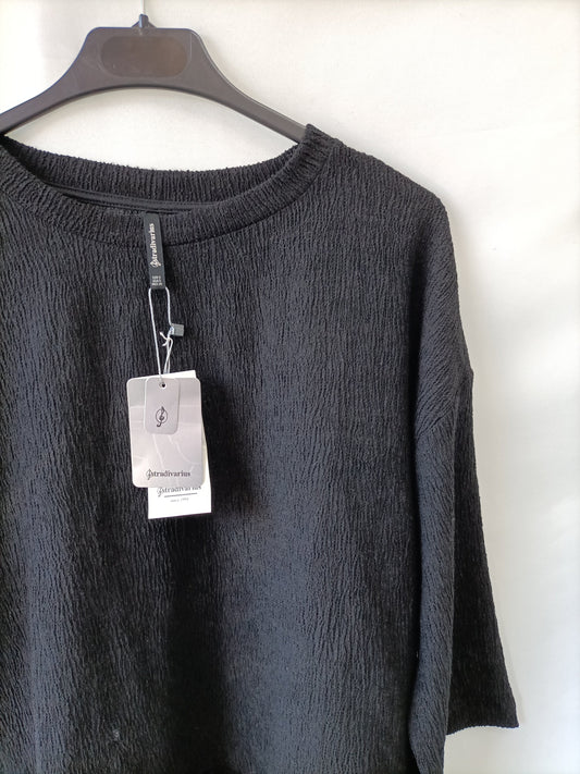 STRADIVARIUS. Camiseta fluida negra bajo encaje T.s