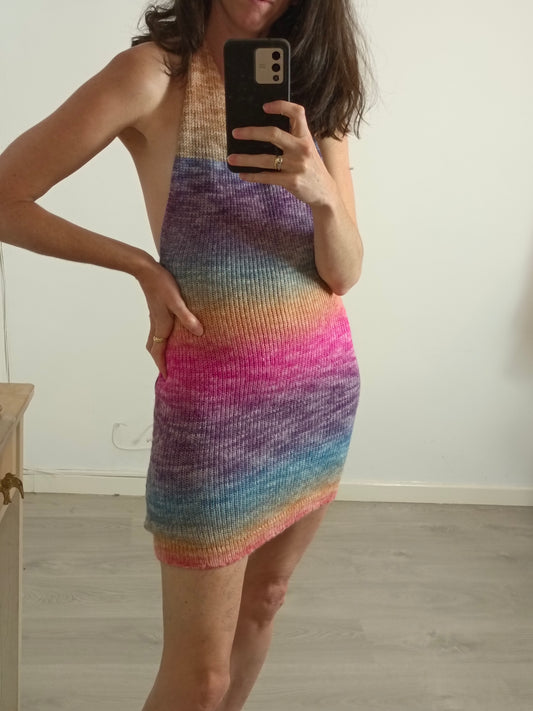 JUANJO OLIVA. Vestido corto bicolor detalle cola. T 38