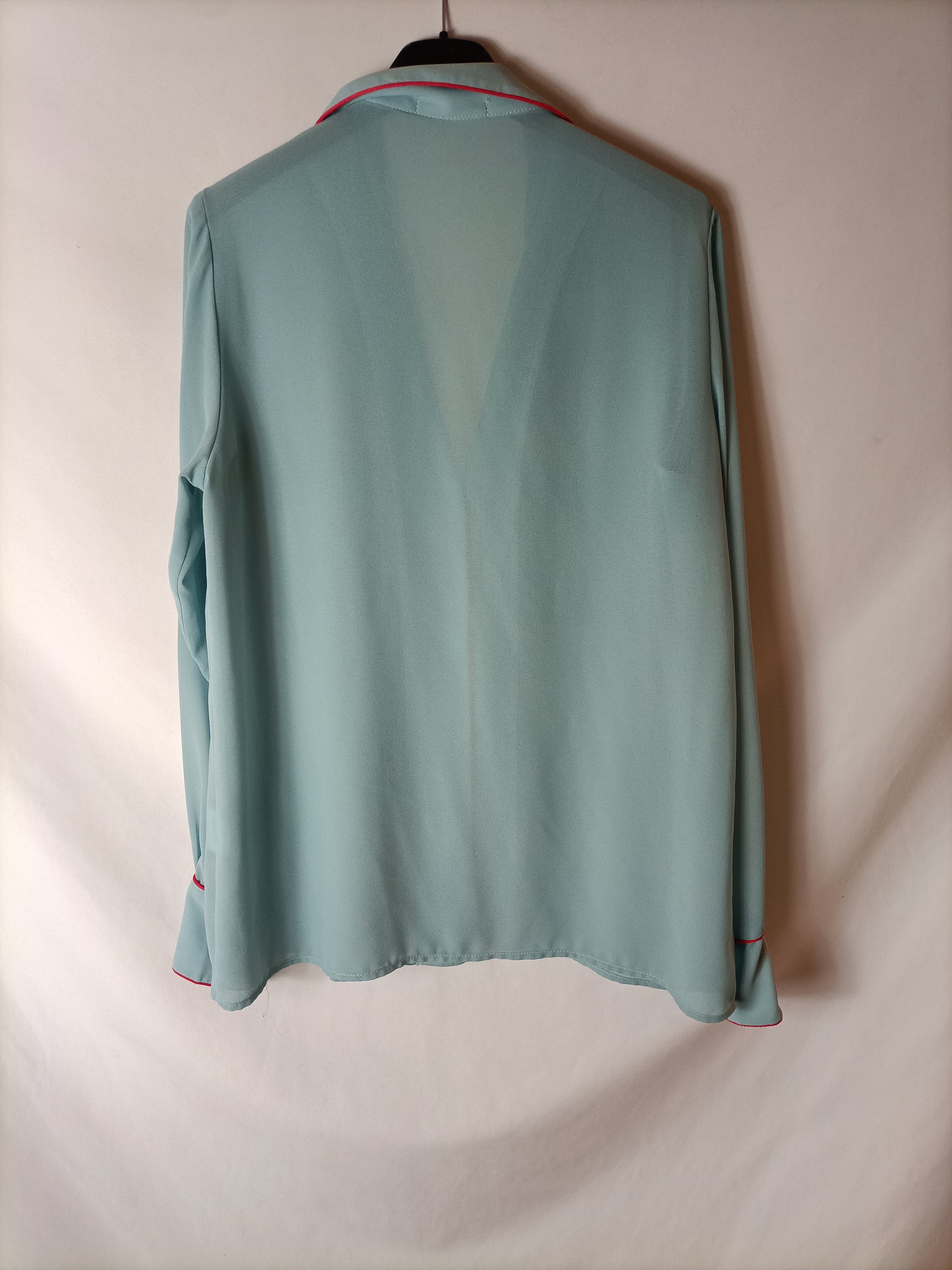 blusa fluida verde agua con botones y ribete en rojo. de sisa a sisa 48 cm. colección biombo.