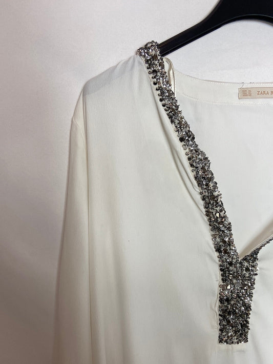 ZARA. Blusa blanca fluida con detalle de lentejuelas T.XL
