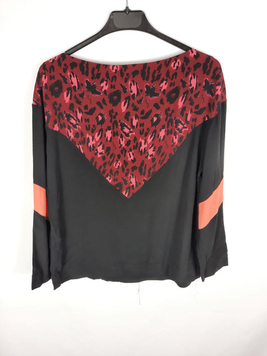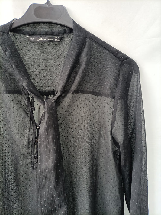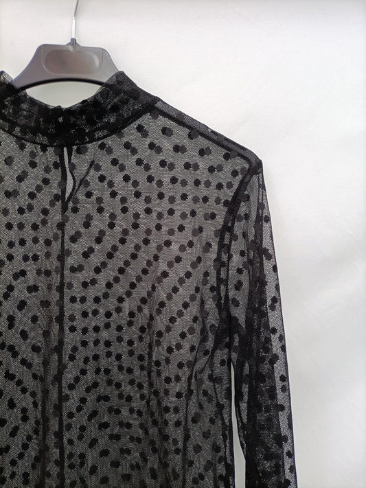 ZARA. Jersey/top negro doble textura con mangas estampadas flores T. m