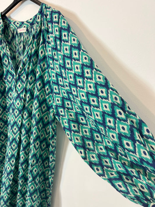 BUGANVILIA. Long greenish blue silk print dress, size 3XL