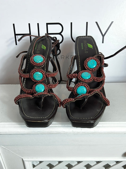 SANDALO ESSENCE. Brown sandal with blue rhinestone details. Size 39