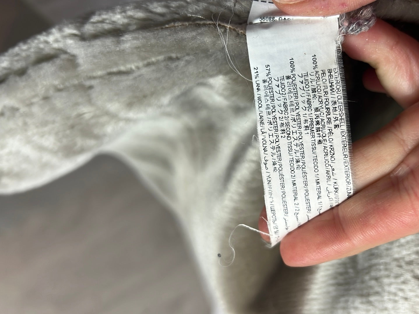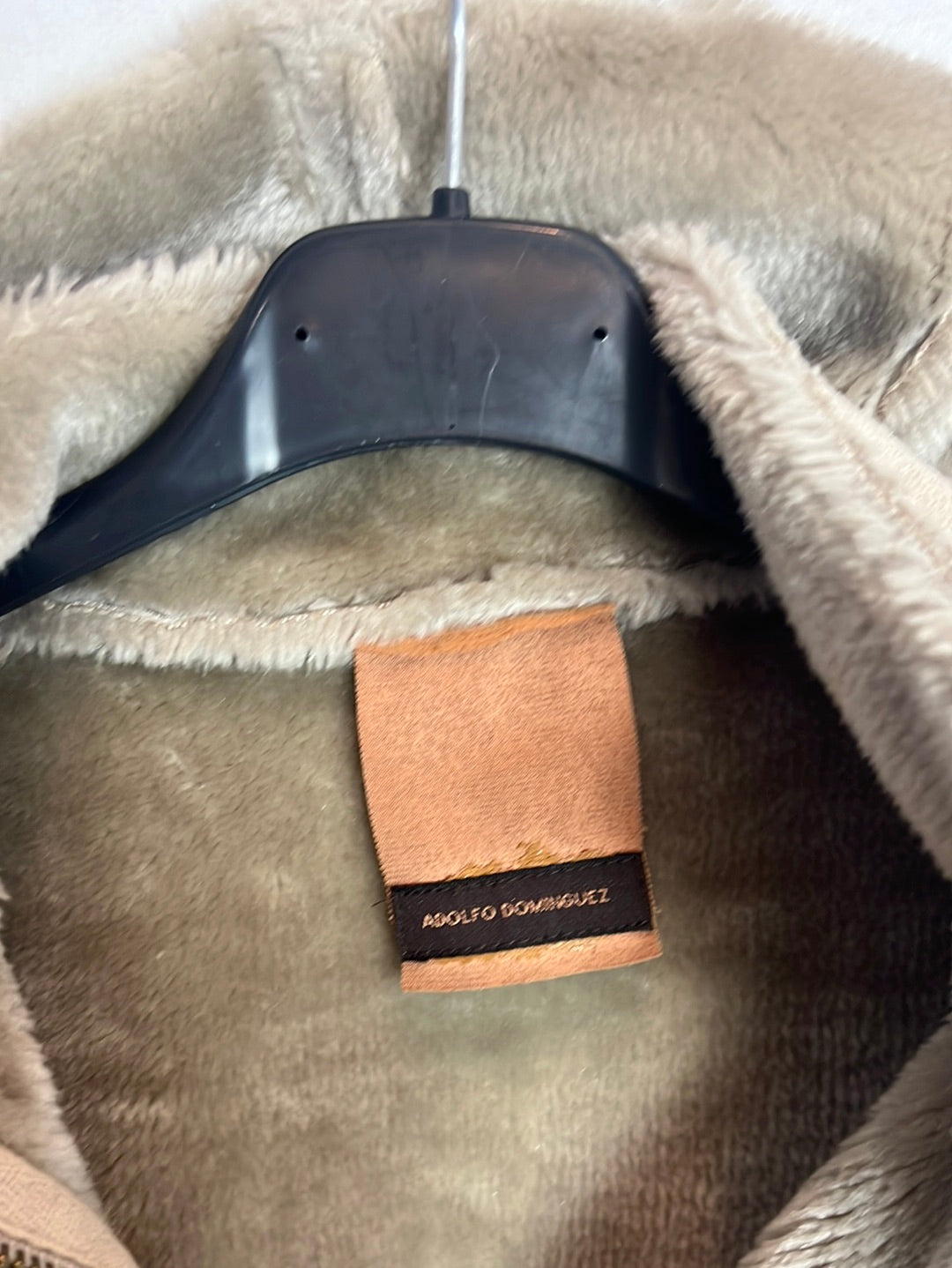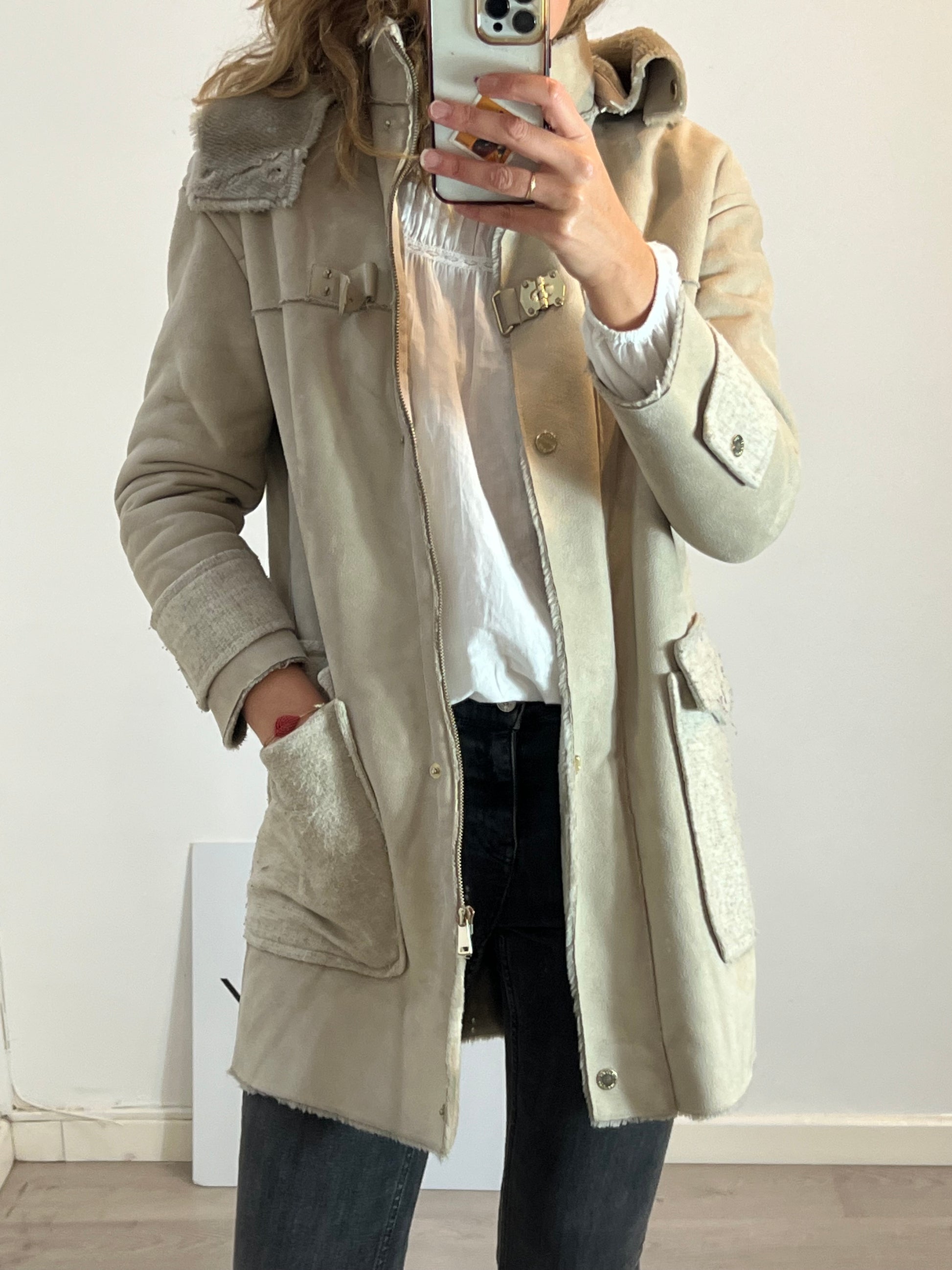abrigo beige textura pelo interior. Largo 86cm, de sisa a sisa 50cm. Tara: tiene alguna pelotilla en los bolsillos y un poco despegada piel de la hebilla