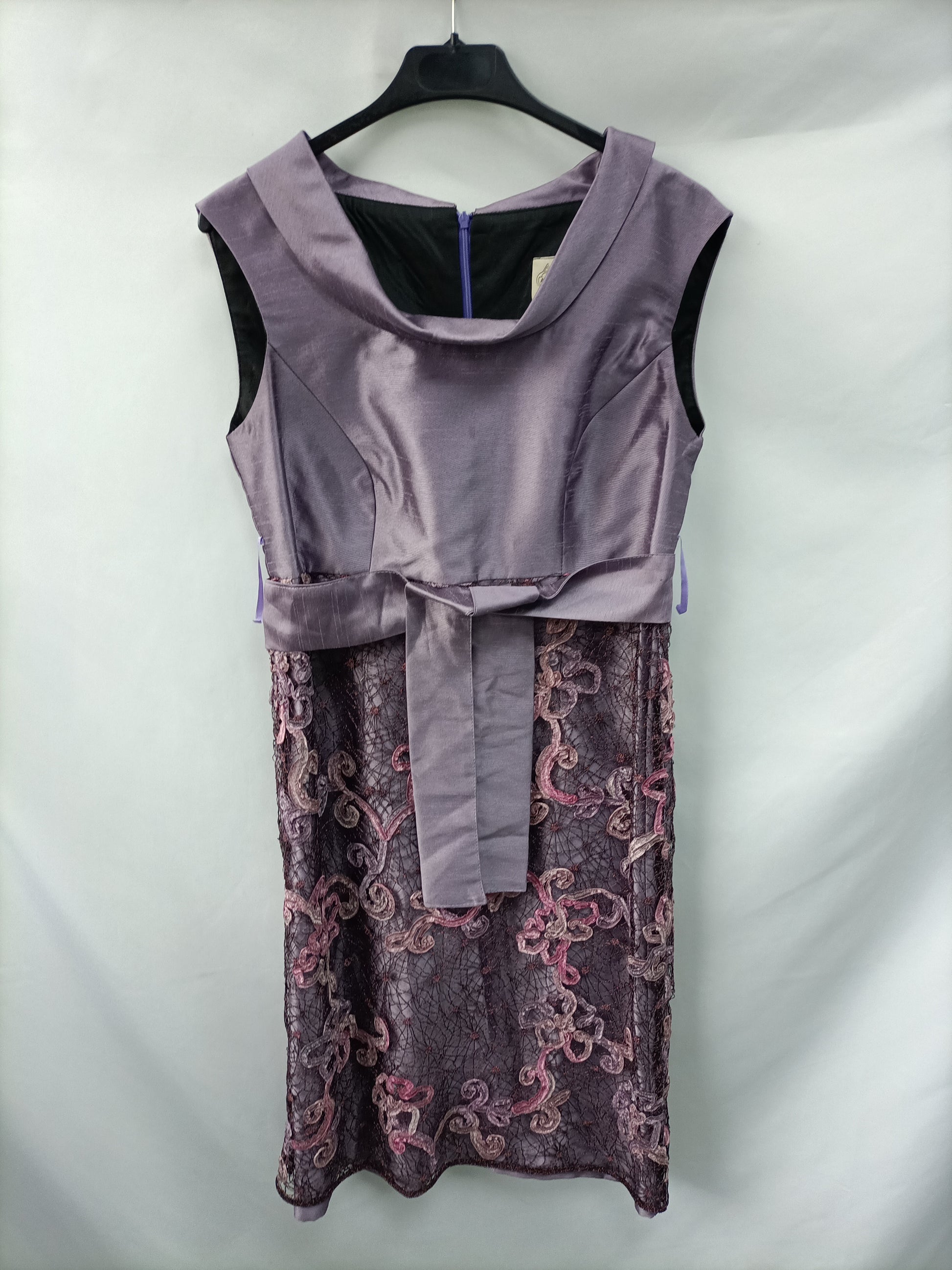 Purple party dress with a lace hem and a purple satin top. It's stretchy and fastens with a zipper. 38" long.