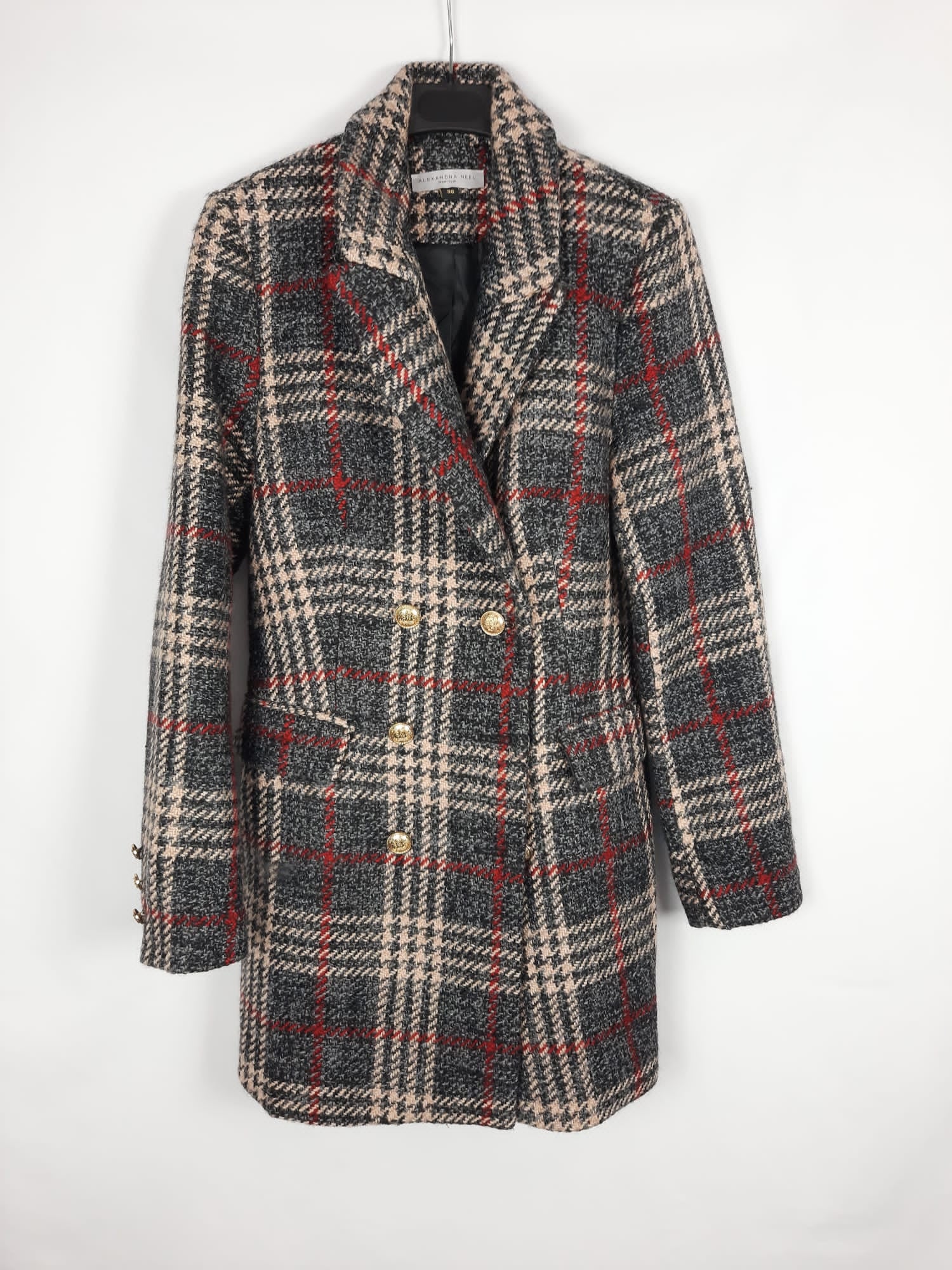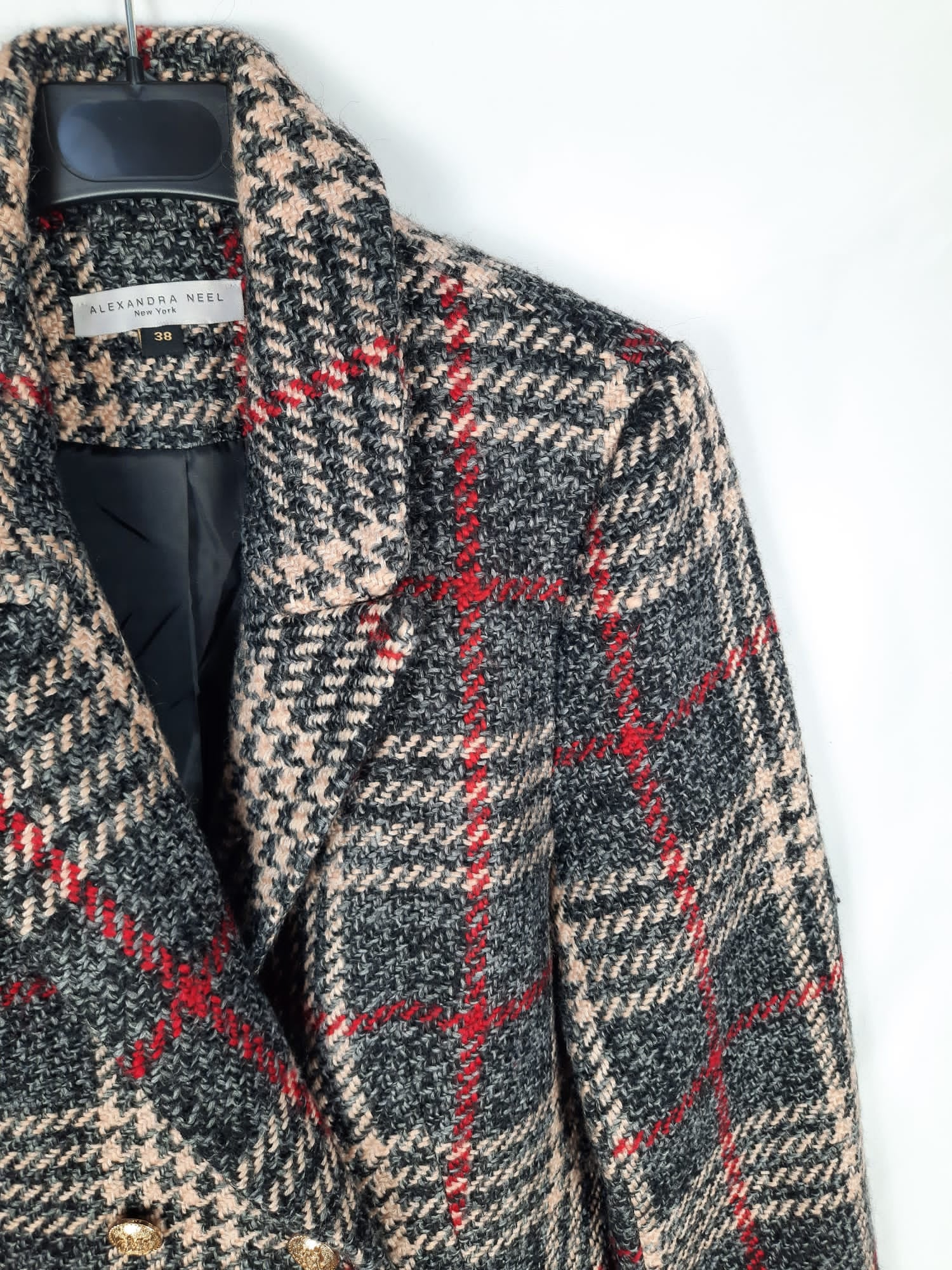 Alexandra Neel. Houndstooth check coat. Double-breasted with gold buttons. Non-stretch. Armhole to armhole 42 cm, length 85 cm.