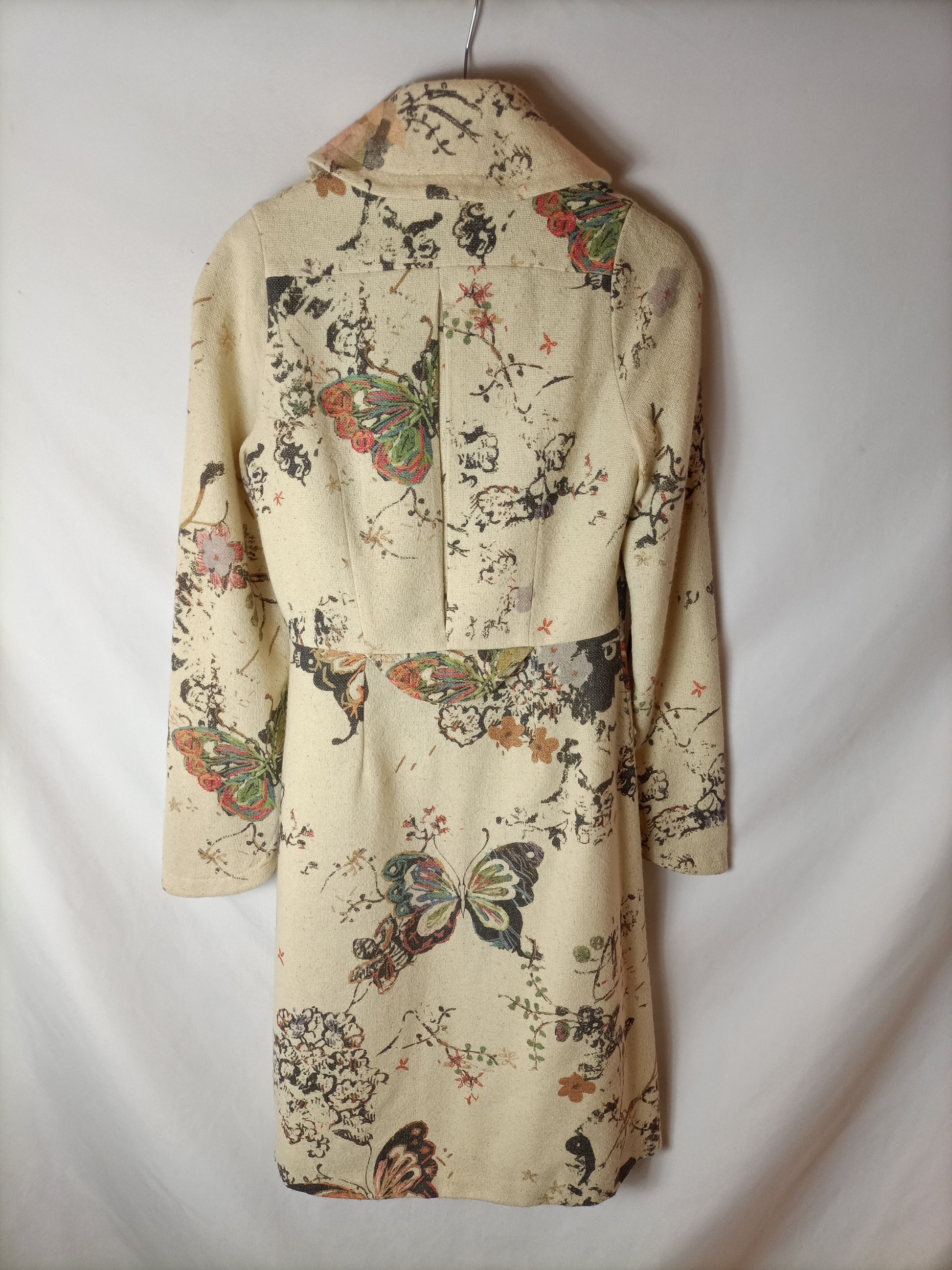 Flowing beige coat with a floral print. 100% wool exterior and 100% silk interior.