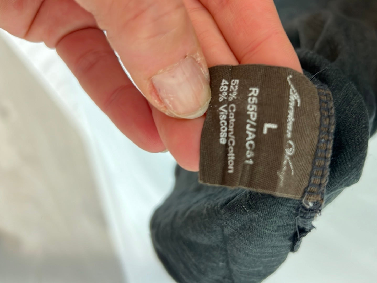 Dark gray cotton V-neck T-shirt. 18" (45cm) from armpit to armpit, 24" (61cm) long.