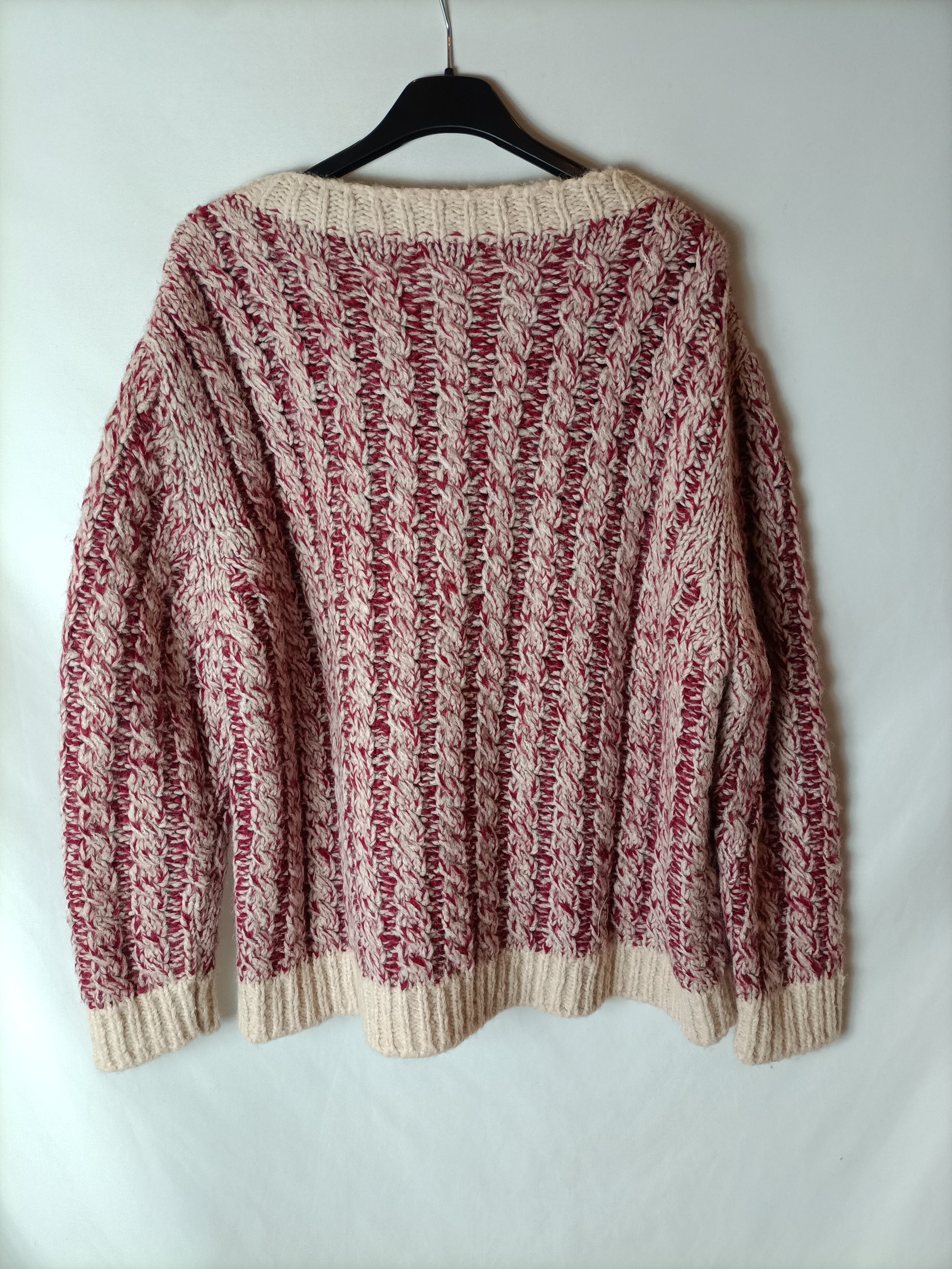 Two-tone cable-knit sweater. Beige and light burgundy.