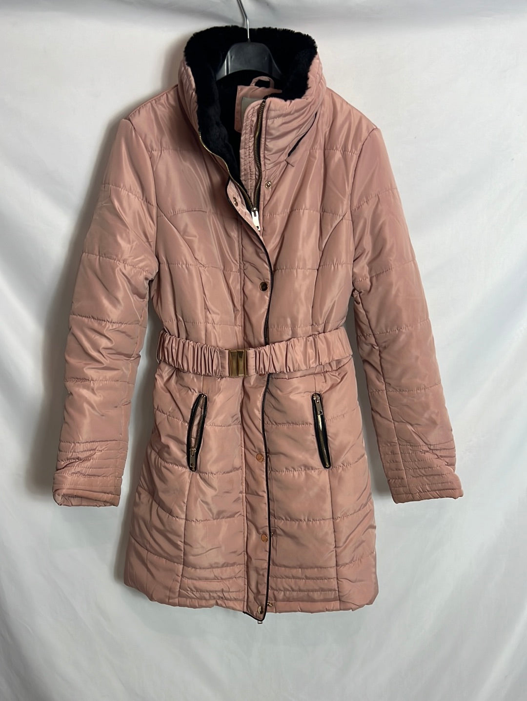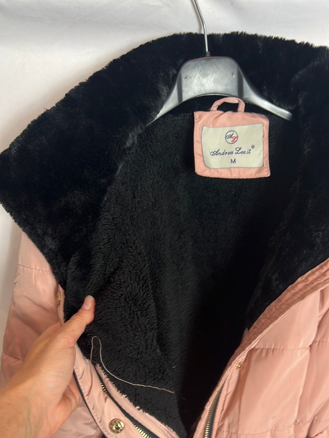 Pink feathers with a belt and black fur inside. Length: 84cm