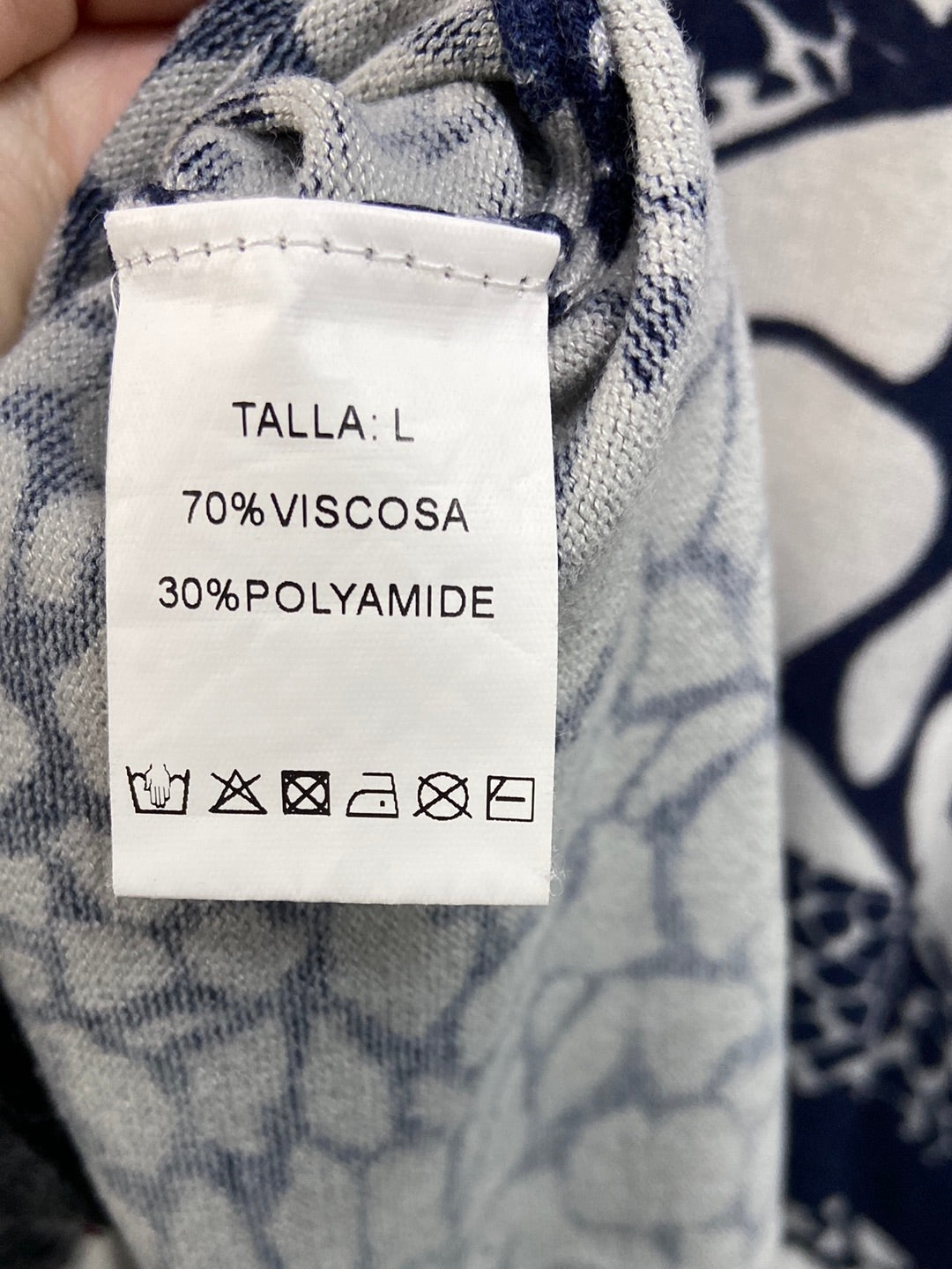 Gray and blue sweater with rhinestone detailing. It has shoulder pads and is elastic. It's 67 cm long.