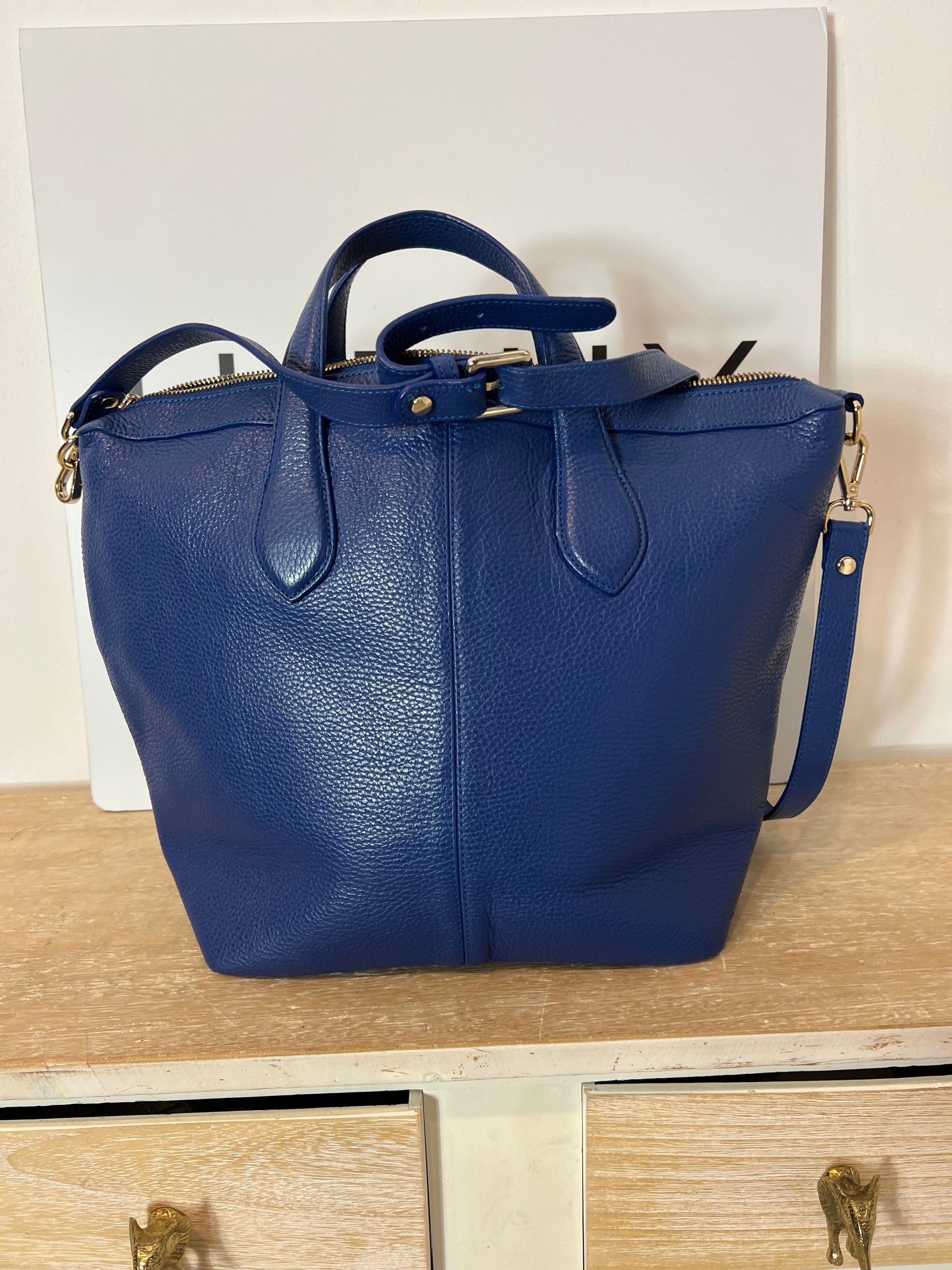 Bolso azul Klein estilo shopper de piel. Asa corta fija y larga extraible. Ancho base 28cm, alto 31cm, ancho cremallera 40cm