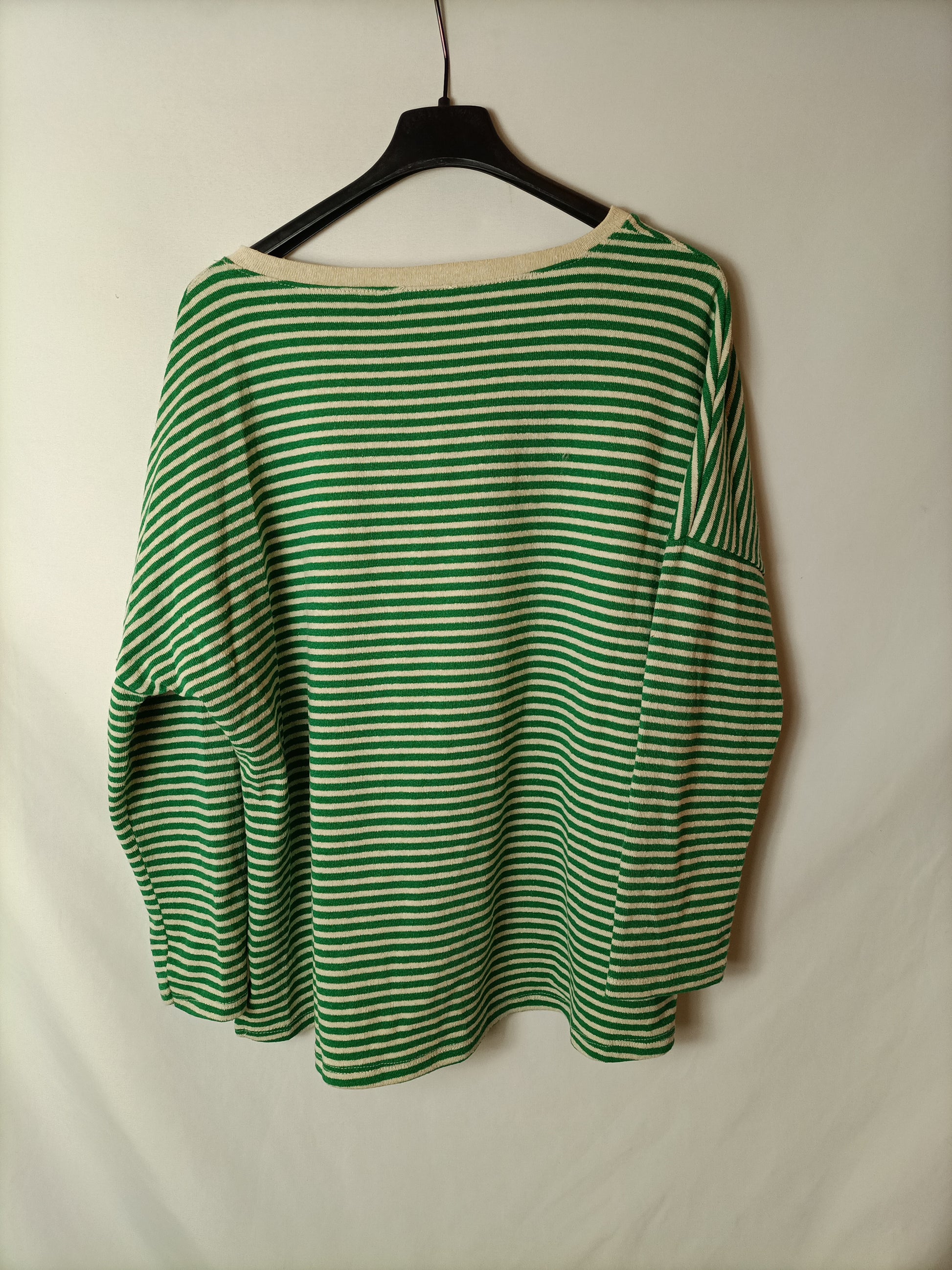 Green and beige striped knit T-shirt. Elastic. Length 57 cm.