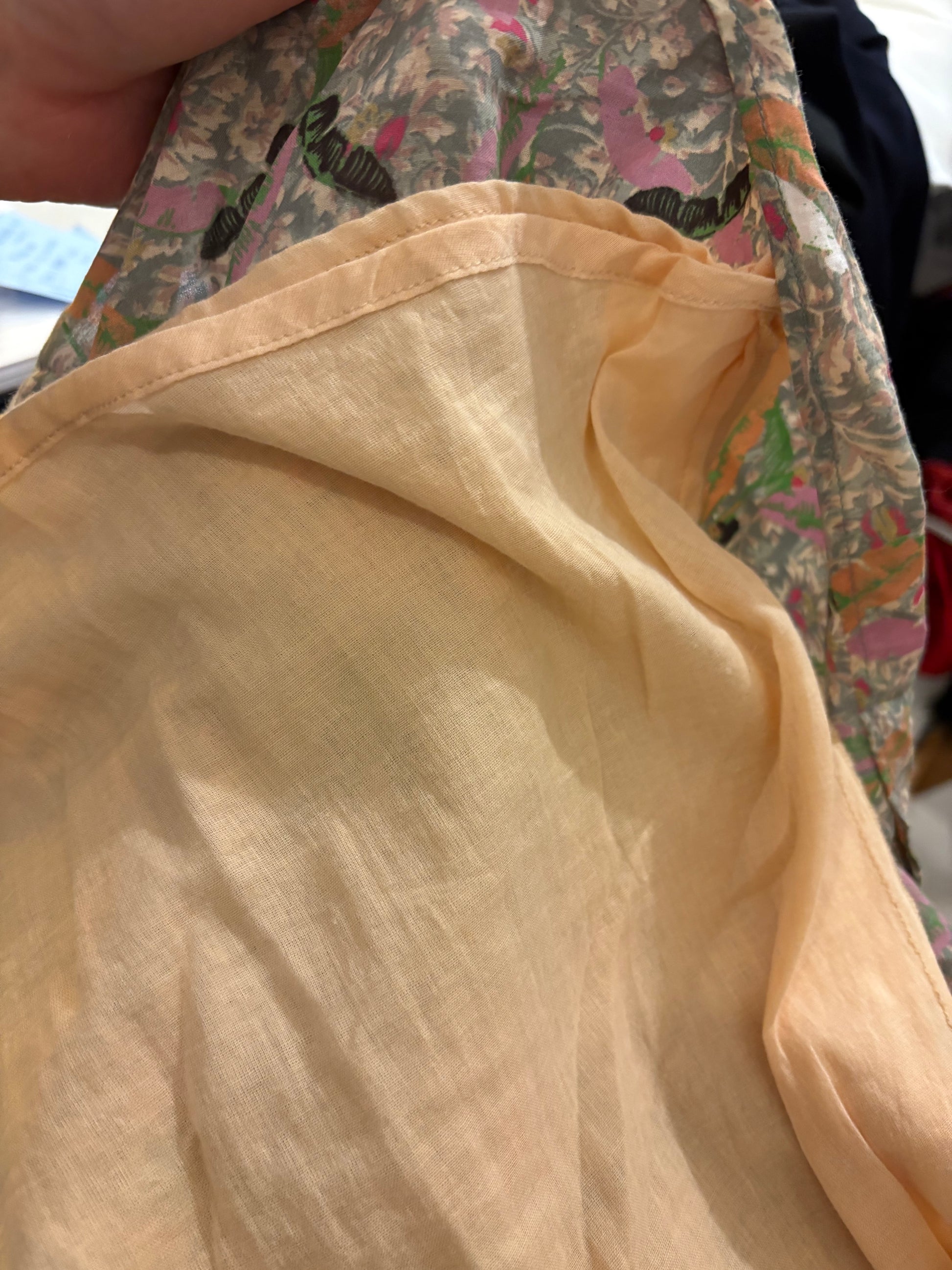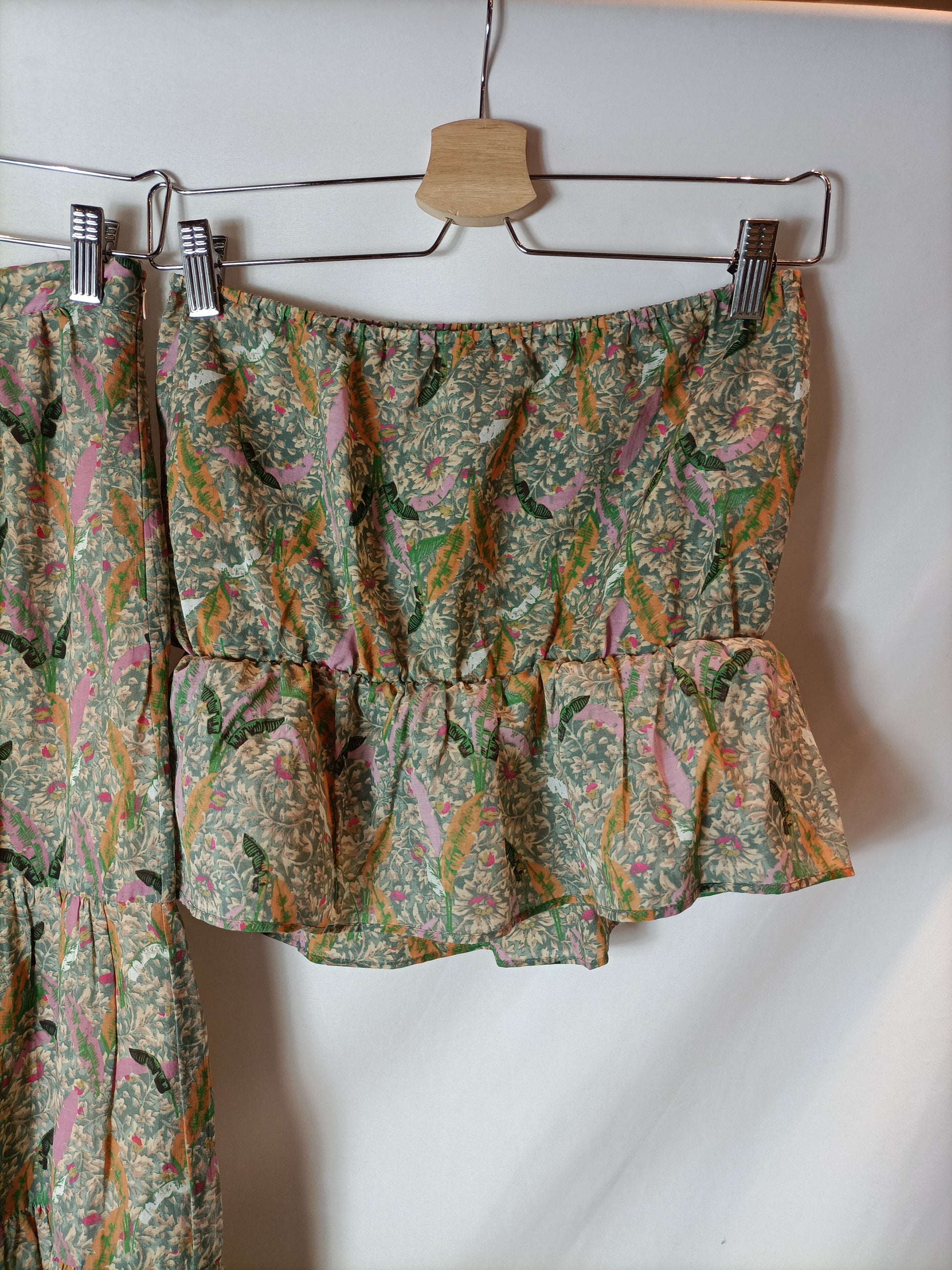 Floral top and skirt total look. Skirt with elastic waistband and side zipper. 35cm semi-elastic waist, 80cm long. Top: 33cm elastic from armhole to armhole, 22cm long.
