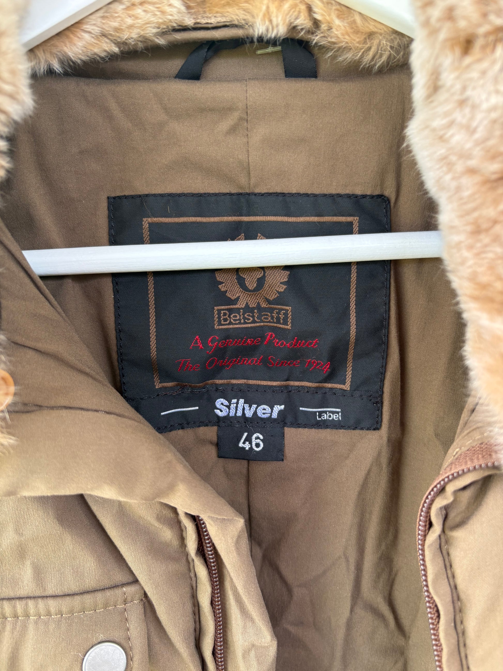 IN VERY GOOD CONDITION. Size 46 on label, Back 47 cm, length 66 cm. Belt missing.