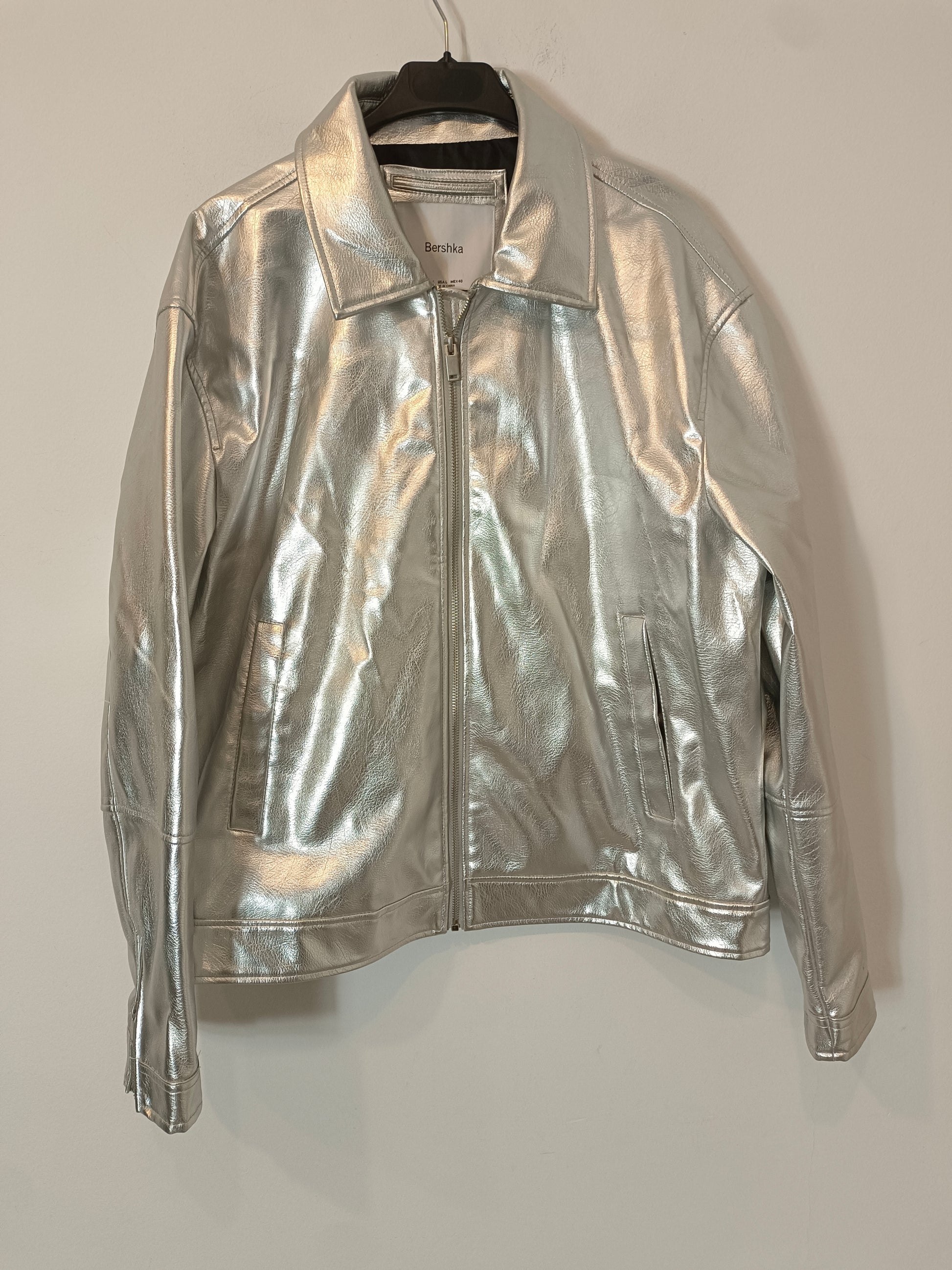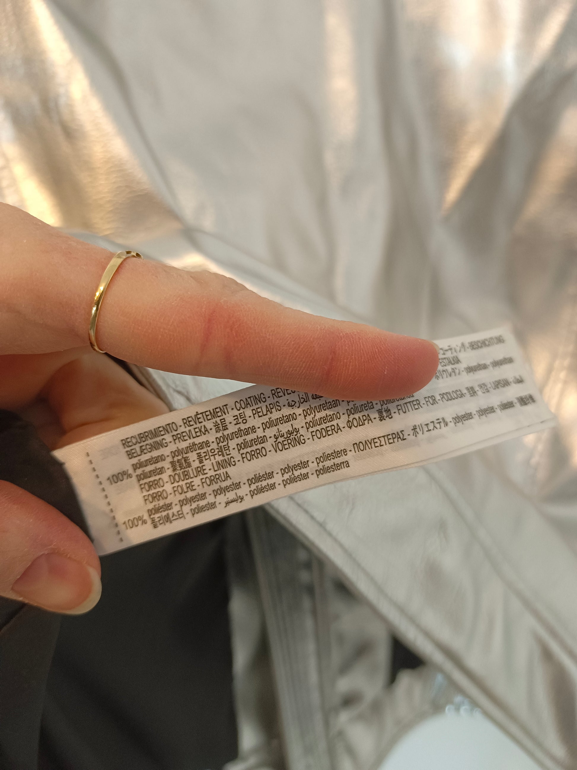 Long beige jacket with black leatherette details. From armpit to armpit 50 cm, length 73 cm.