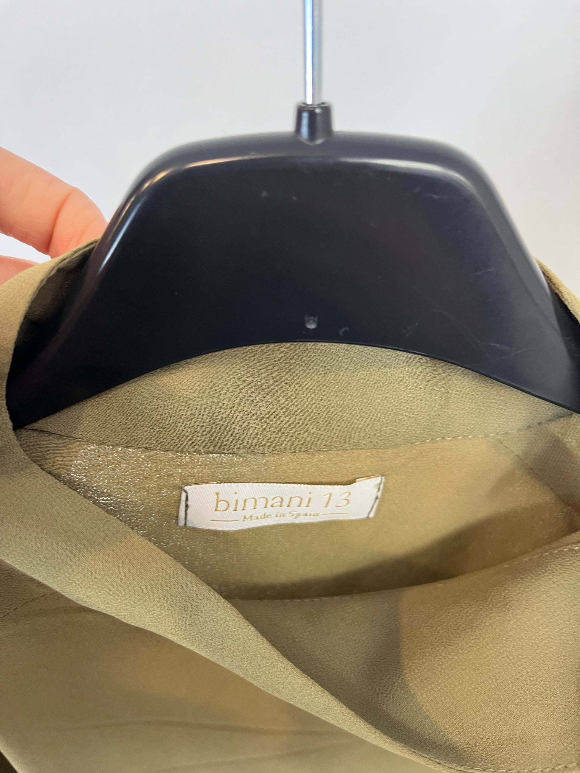 BIMANI. Flowing green blouse with a bow at the neck and gold buttons. Size XL