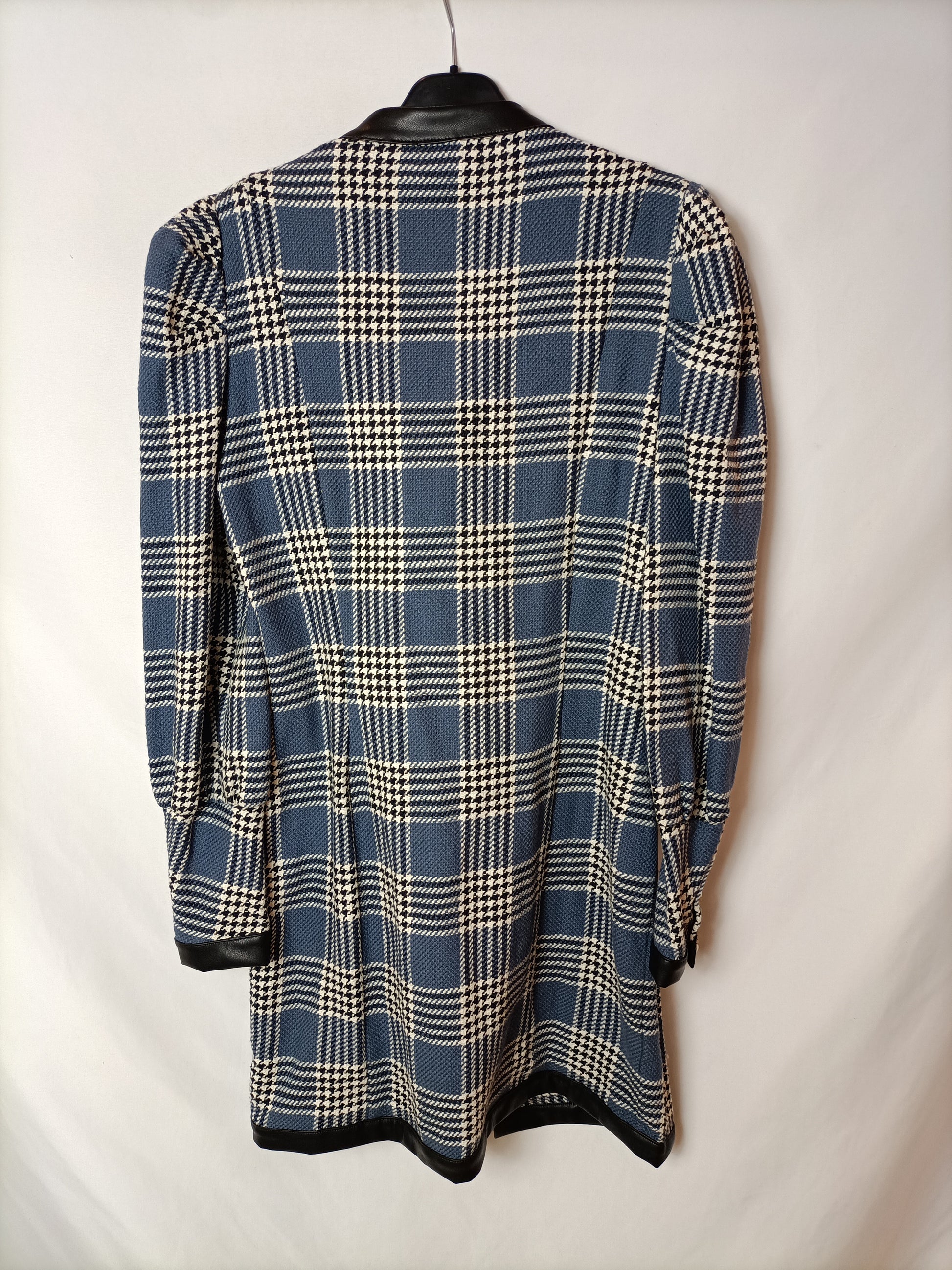 Short houndstooth jacket/dress in blue and black tones with jewel buttons.