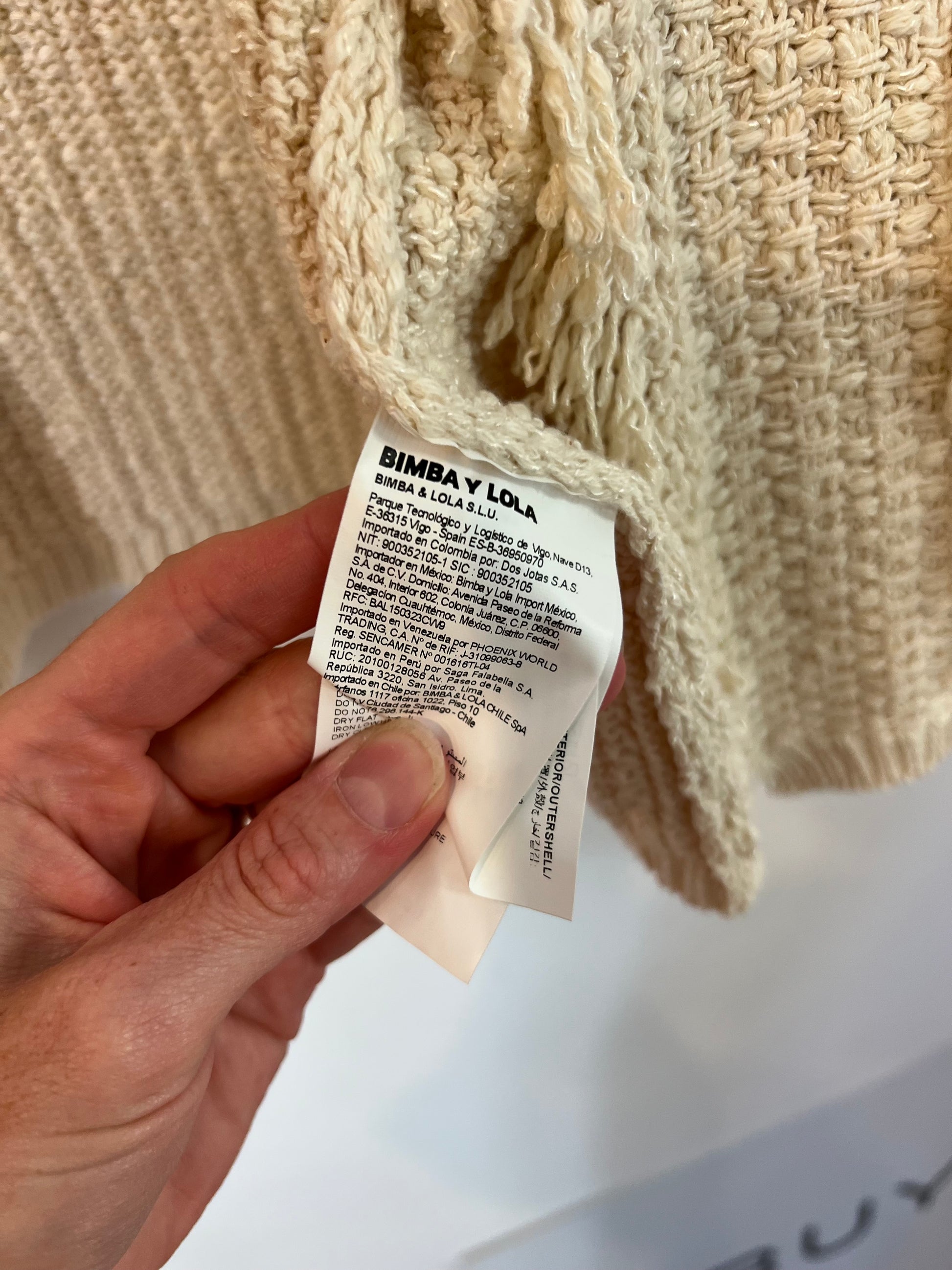 Beige textured jacket with fringes. 59 cm from armpit to armpit, 57 cm long.