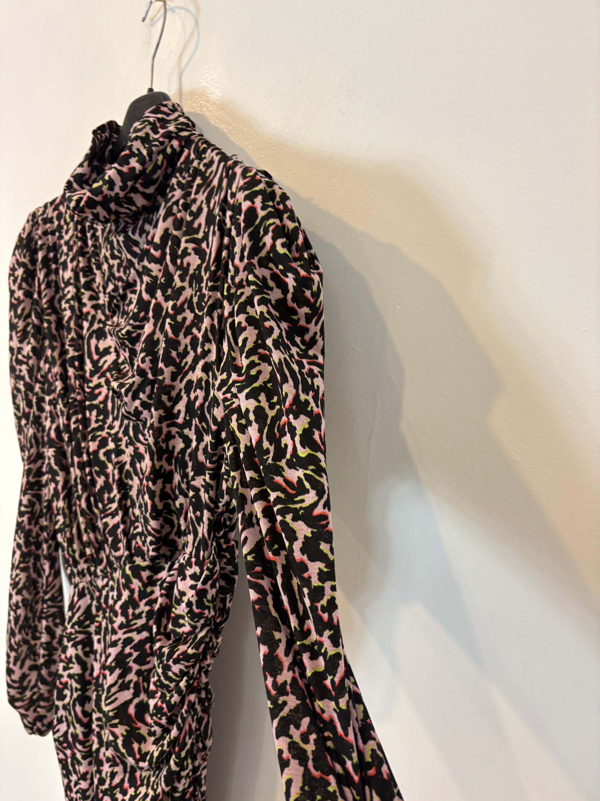 Long brown wrap dress with zipper on the side.