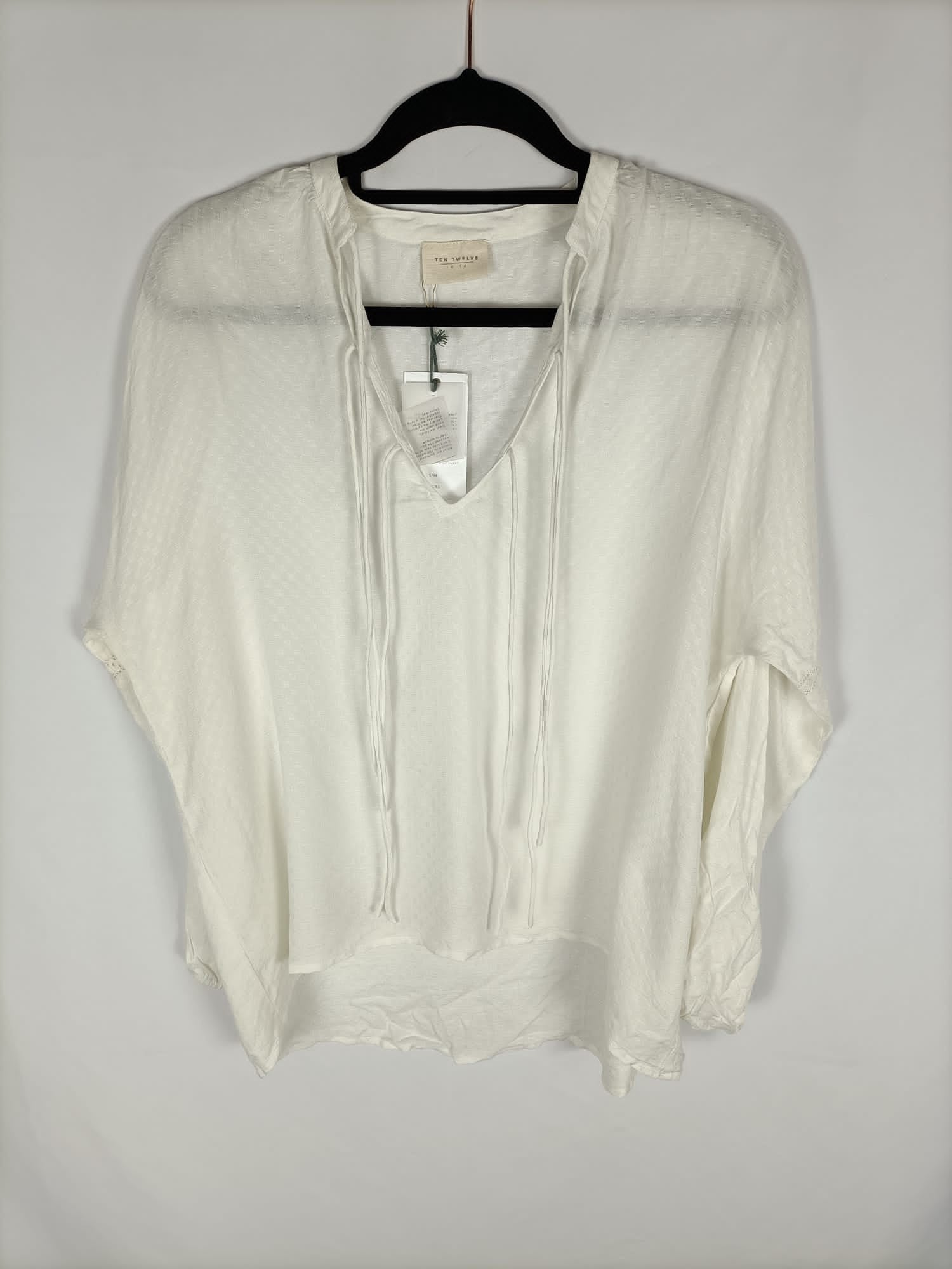 White flowing blouse with a drawstring neckline and adjustable lace sleeves.