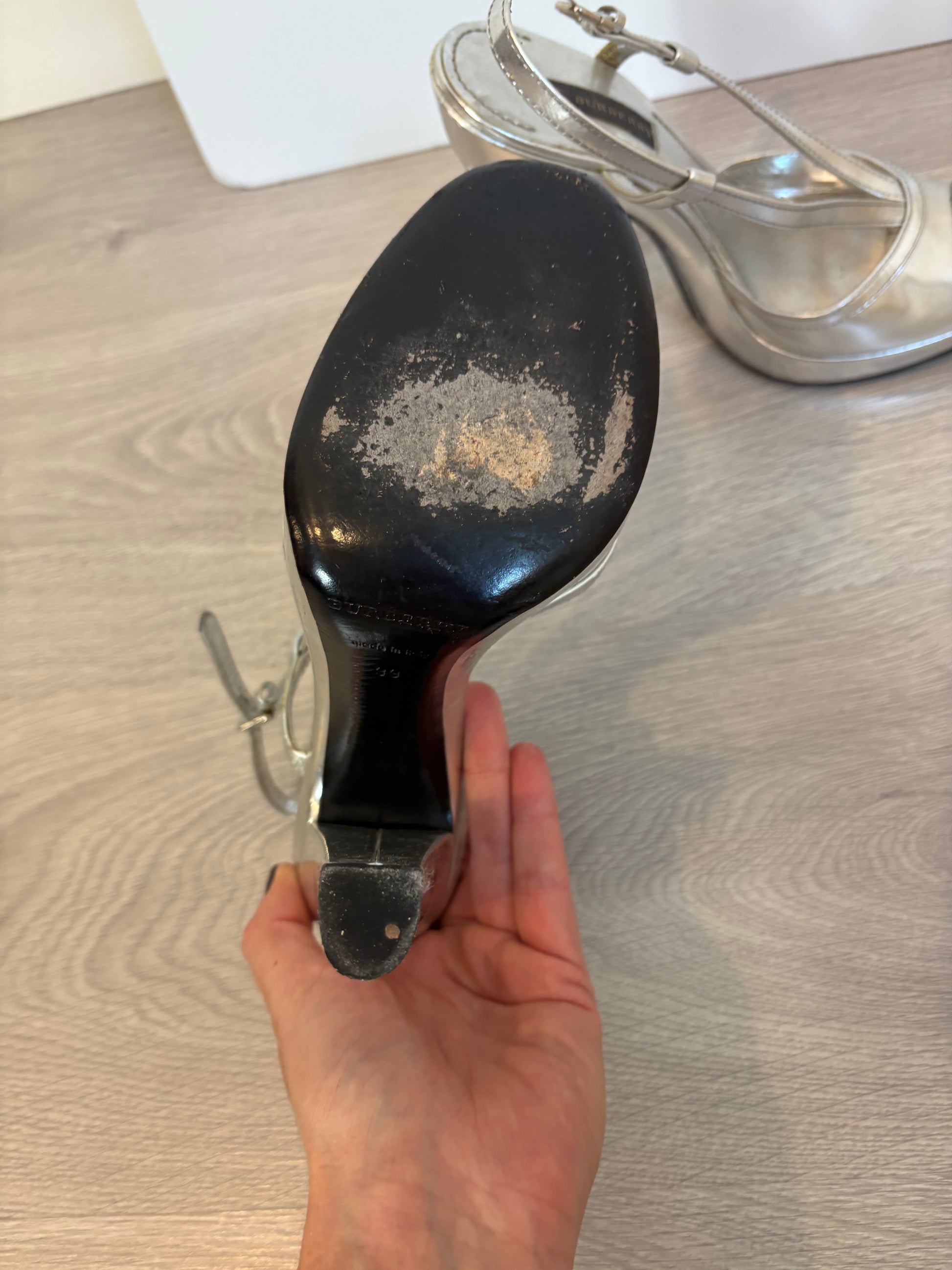 Silver platform sandals. Mark on the inner heel is not very practical.