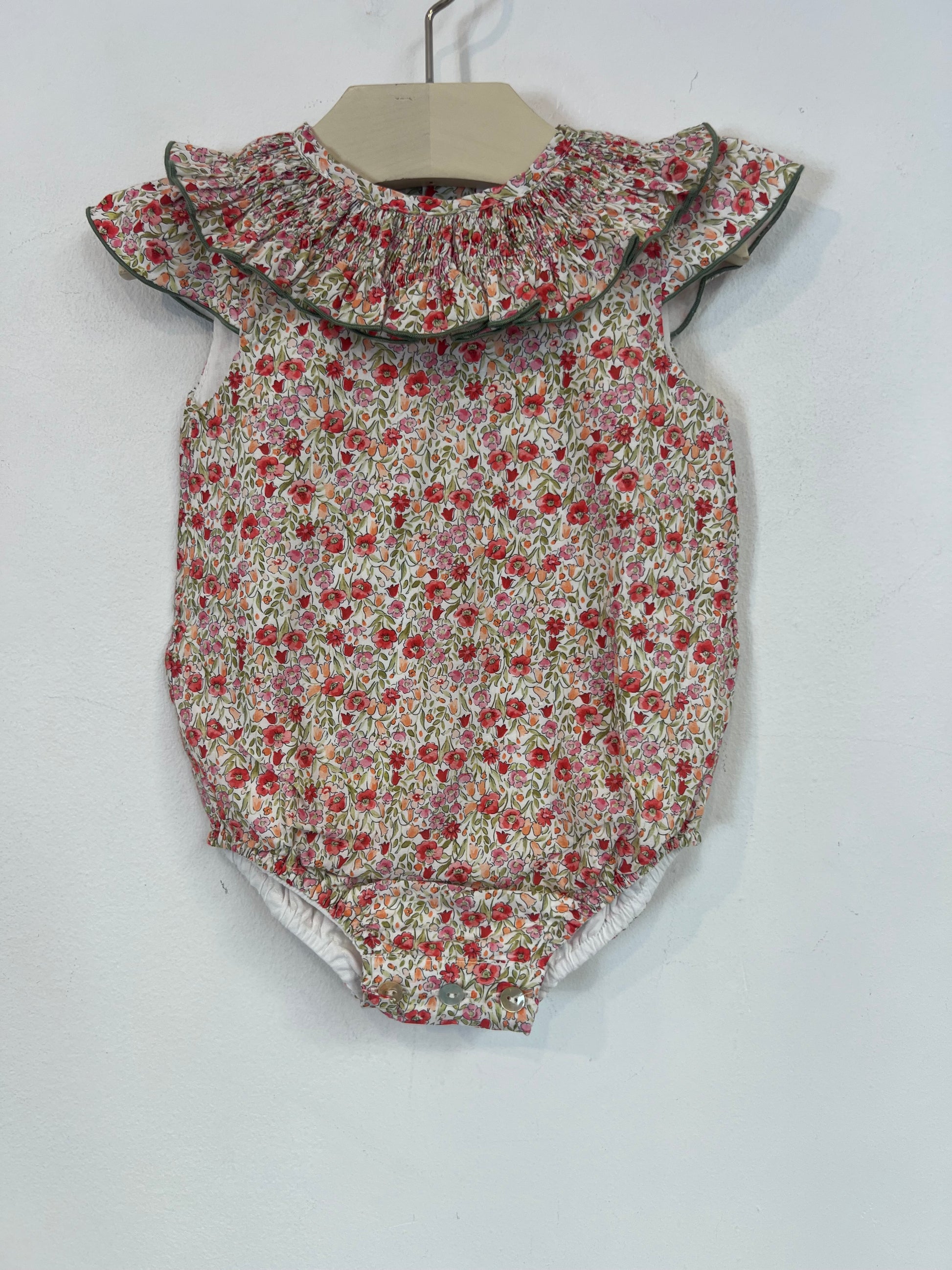 pink and green floral romper with neck details
