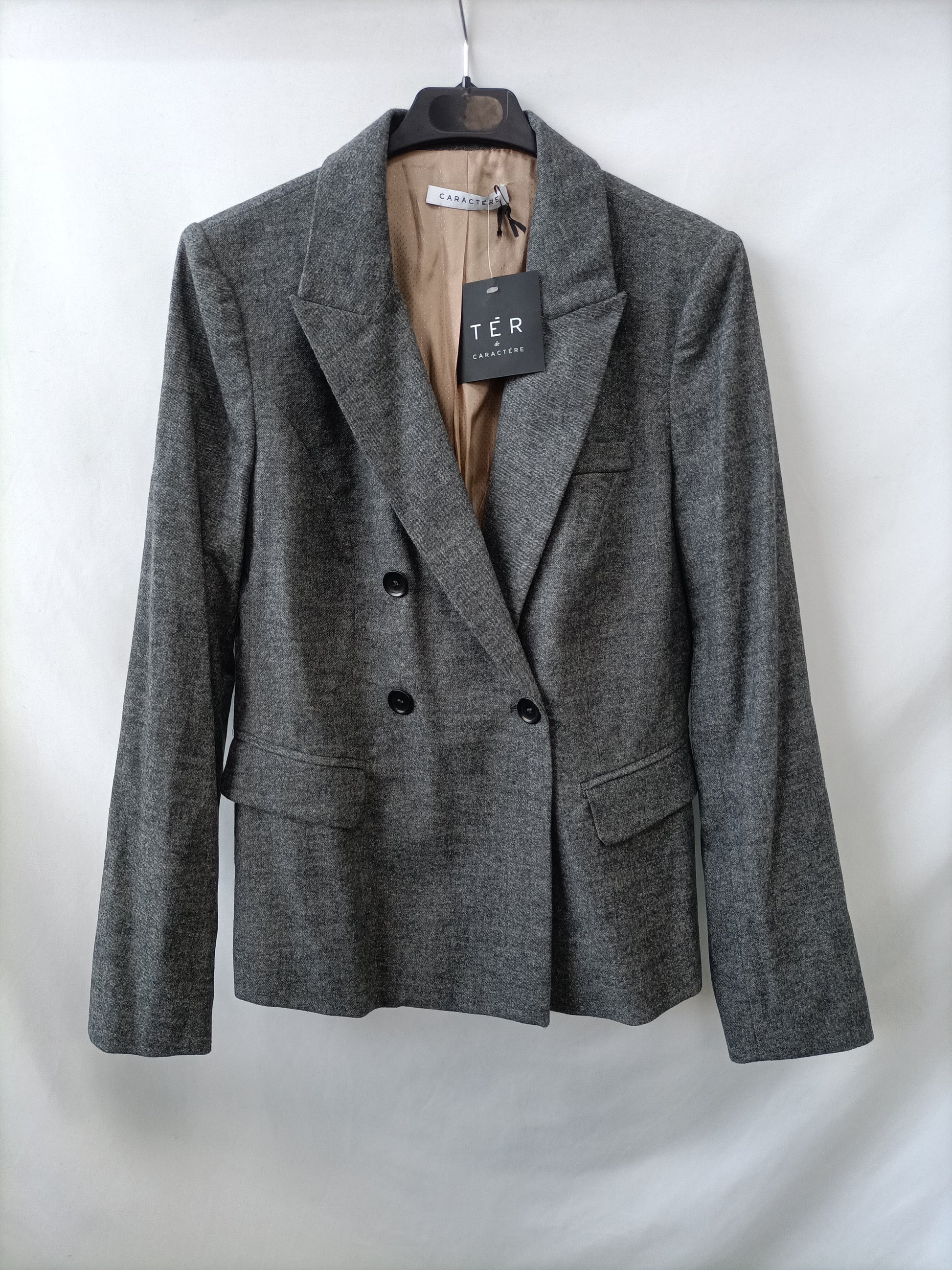 NUEVO CON ETIQUETA. Blazer cruzada gris de espiga. De sisa a sisa 48 cm largo 67 cm. Talla como una S/M