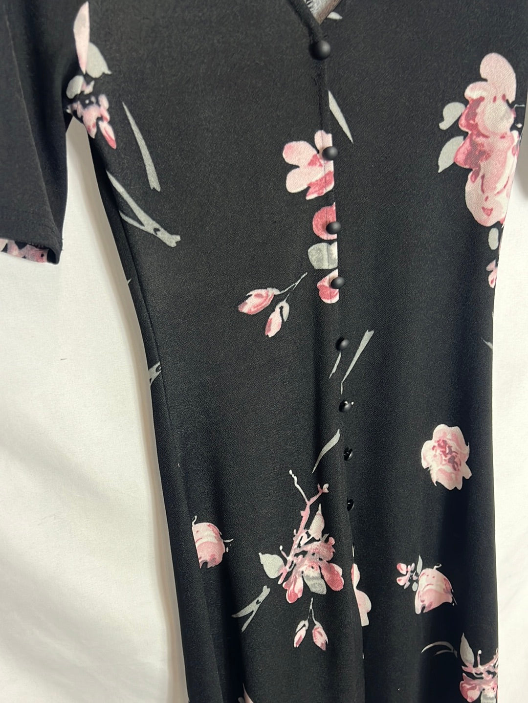 Flowy, stretchy black midi dress with pink flowers. Front faux button detail. 116 cm long.